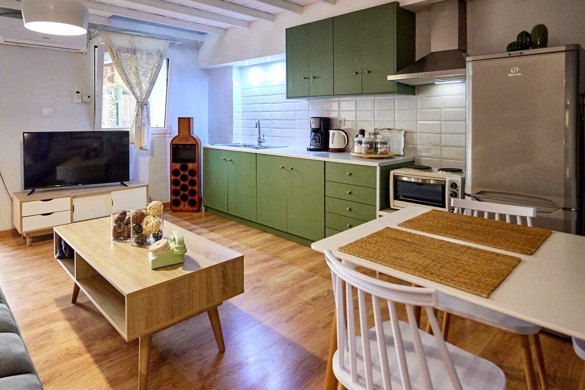This 50 m2 apartment is designed to accommodate up to 3 guests offering an unforgettable stay with its stunning sea views and prime downtown location. It features an open plan living area, with a cozy Queen-size bed and a living room with a sofa bed separated by a bookcase. For your convenience, the apartment also includes a fully equipped kitchen, a dining area, a washing machine, a TV and a big closet. The bathroom is equipped with a shower, fresh towels, and all essential bath amenities.