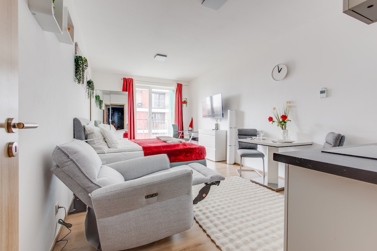 Наслаждайтесь нашим недавно отремонтированным люксом для 4 гостей в современном здании апарт-отеля, идеально подходящем для пар и семей. Стильная мебель, просторная планировка, лучшие удобства, полностью оборудованная кухня, Wi-Fi, смарт-телевизор, удобные кровати. Бесплатная парковка. Крытый бассейн, аквапарк и СПА находятся всего в 9 минутах ходьбы от нас (за дополнительную плату). В здании можно бесплатно пользоваться тренажерным залом, стойкой регистрации, прачечной (за отдельную плату), коворкингом и комнатой для вечеринок для фильмов или игр. Отдохните на нашей удивительной террасе на крыше с видом на Прагу.
