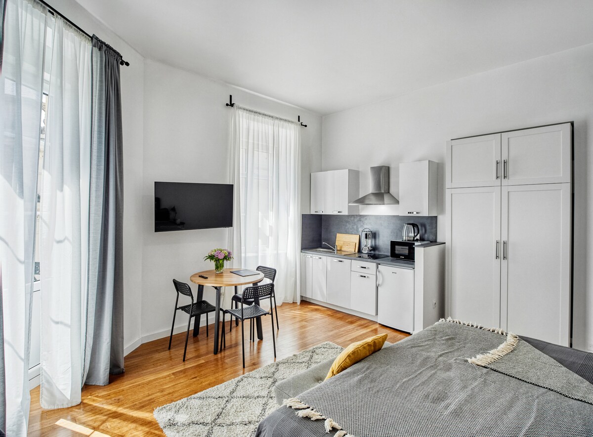 СОВЕРШЕННО новая элегантная квартира в ЦЕНТРЕ ГОРОДА менее чем в 10 минутах ходьбы от главной площади и железнодорожной станции. Жилье расположено на тихом заднем дворе на главной улице, так что вы можете наслаждаться тихими ночами. Есть одна спальня с двуспальной кроватью размера Queen size, гостиная с телевизором + NETFLIX и раскладным диваном (размера Queen size), ванная комната с туалетом и просторная душевая кабина. Вся мебель и бытовая техника совершенно новые. БЕСПЛАТНЫЙ чай и кофе,БЕСПЛАТНЫЕ полотенца.