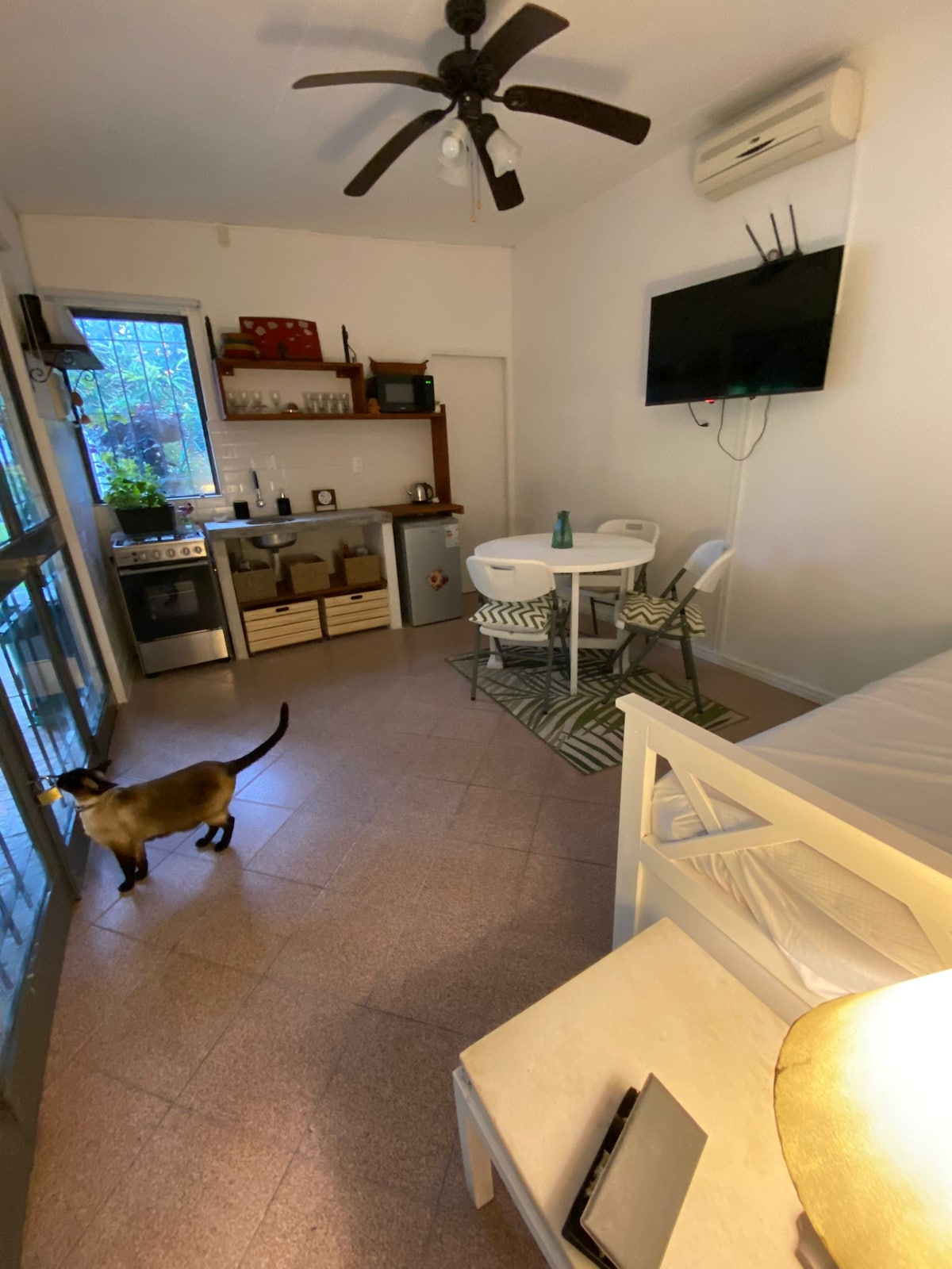 Apto privado al fondo con entrada independiente a pasos del nuevo centro shopping, un buen punto para conectar con toda la ciudad. Está en el fondo compartido con mi casa, donde habita nuestra perra, Clara (una adorable Golden). En el entrepiso está el dormitorio con un sommier de 2 plazas y tv smart 32. Abajo se encuentra la sala con ventanales hacia el fondo y un baño completo. Hay una barbacoa techada contigua que se puede utilizar, con la opción de un área para cocinar.
