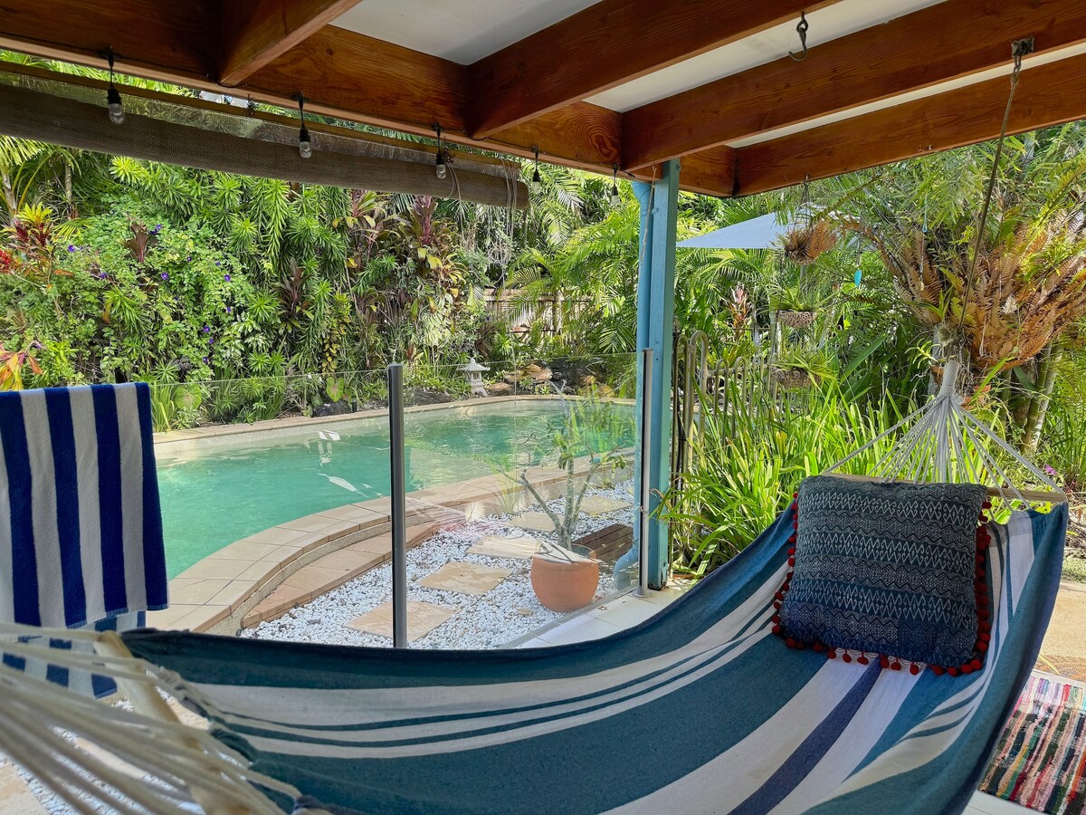 Маленький кусочек рая с большим бассейном у вашего порога и пляжем в нескольких минутах ходьбы. 5 минут езды до Палм-Коув и и 30 минут до города. Наш гостевой дом с пляжной тематикой в тропическом саду имеет все домашние удобства. Просторная, с кондиционером, кухней, барбекю и мебелью у бассейна. Бесплатный Wi-Fi + Netflix. Наш дом находится через дорогу от сада, поэтому мы всегда рядом, если вам понадобятся советы о местных особенностях или что-либо еще. Приезжайте и остановитесь, мы будем рады поделиться с вами нашим маленьким кусочком рая!