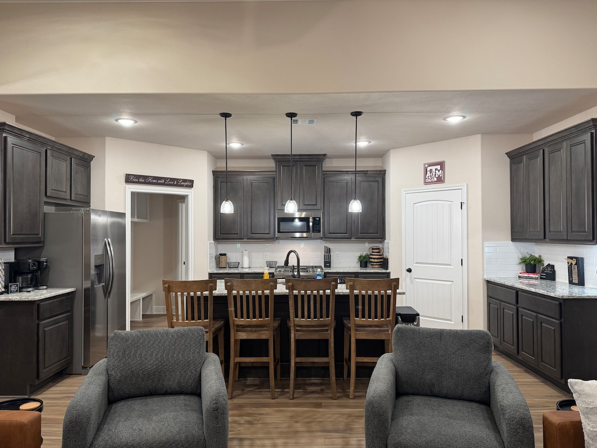✨ Наше жилье быстро бронируют на праздники и выходные, поэтому мы всегда рекомендуем бронировать заранее, чтобы заблокировать даты. Идеальное место в Аггиленде! Это современное ранчо вмещает до 9 человек, имеет открытую планировку, 85-дюймовый телевизор Smart TV, зарядное устройство для электромобилей, быстрый Wi-Fi и полностью оборудованную кухню. В нескольких минутах от Texas A&M, Baylor Scott & White Hospital, Santa's Wonderland — идеальное жилье для семей, групп и поездок в день игры. Номер разрешения на краткосрочную аренду в Колледж-Стейшн: STR2021-000013