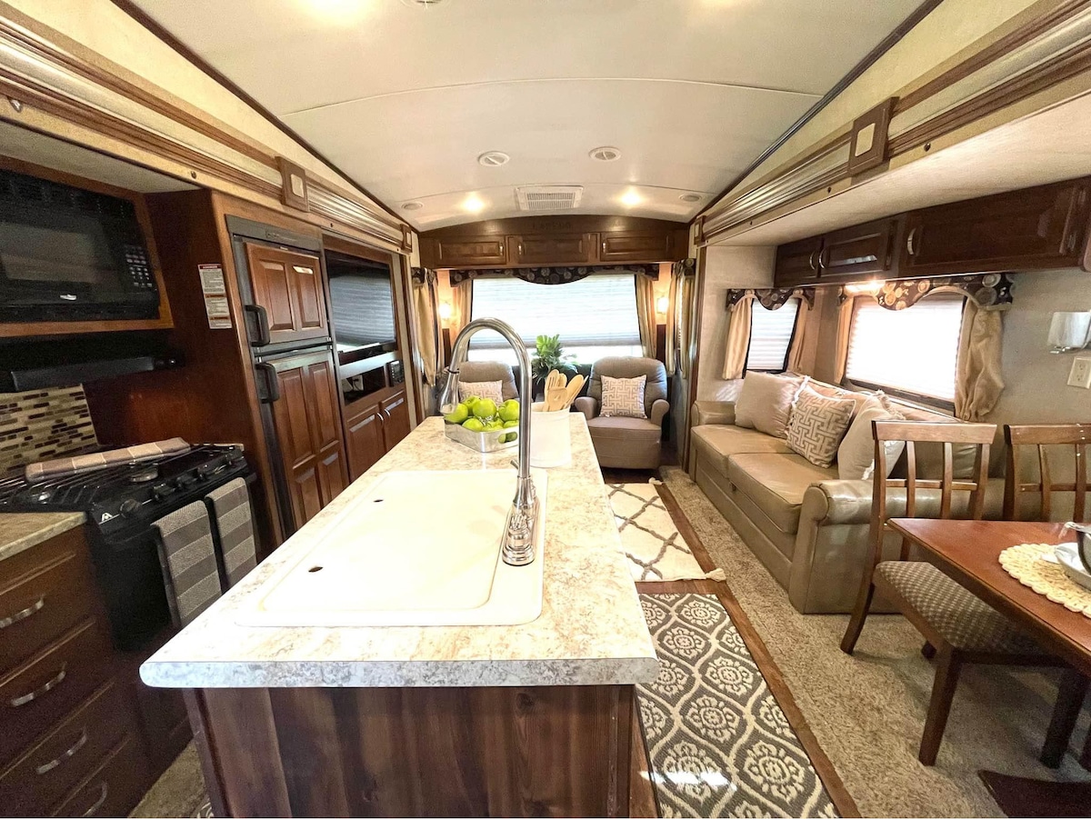 Добро пожаловать в «Время прогуляться»! Этот семейный и домашний пляж красиво оформлен и полностью укомплектован всем необходимым, чтобы исследовать 3 прекрасных пляжа, которые находятся в нескольких минутах ходьбы! Есть открытая зона, в которой также есть занавески и ширмы для уединения! Этот автодом 5-го колеса ОЧЕНЬ просторный и удобный. Мы предоставляем все для дня на пляже! Я разрешаю бесплатное раннее прибытие и не взимаю плату за уборку в этом жилье!