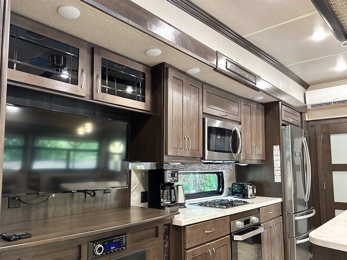 Добро пожаловать в «Время прогуляться»! Этот семейный и домашний пляж красиво оформлен и полностью укомплектован всем необходимым, чтобы исследовать 3 прекрасных пляжа, которые находятся в нескольких минутах ходьбы! Есть открытая зона, в которой также есть занавески и ширмы для уединения! Этот автодом 5-го колеса ОЧЕНЬ просторный и удобный. Мы предоставляем все для дня на пляже! Я разрешаю бесплатное раннее прибытие и не взимаю плату за уборку в этом жилье!