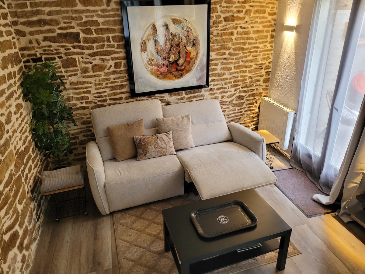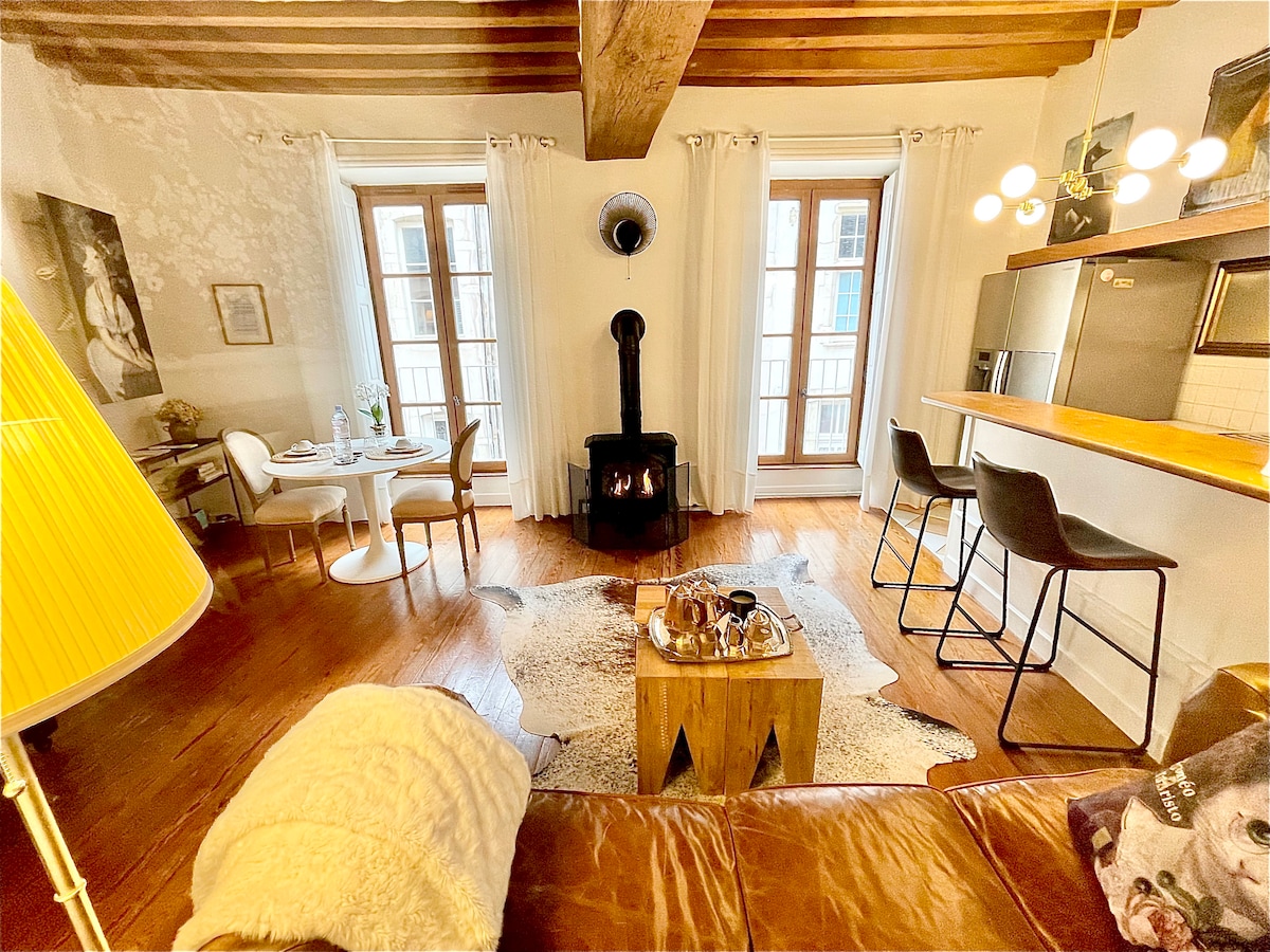 Пересеченная светом квартира, расположенная в историческом центре, приглашает вас отдохнуть. Постельное белье размера King size, постельное белье и хлопковое постельное белье, открытые балки, аккуратный декор, усеянный штрихами. Нейтральные тона, дерево, камень, кожа, чугунная плита, фортепиано, изысканность пространства очаруют вас. Жилье расположено в центре старого района Боне, в 400 метрах от Hospices de Beaune. Идеально для двух уникальных гостей. Парковка в 5 минутах ходьбы. Оптоволоконный Интернет.