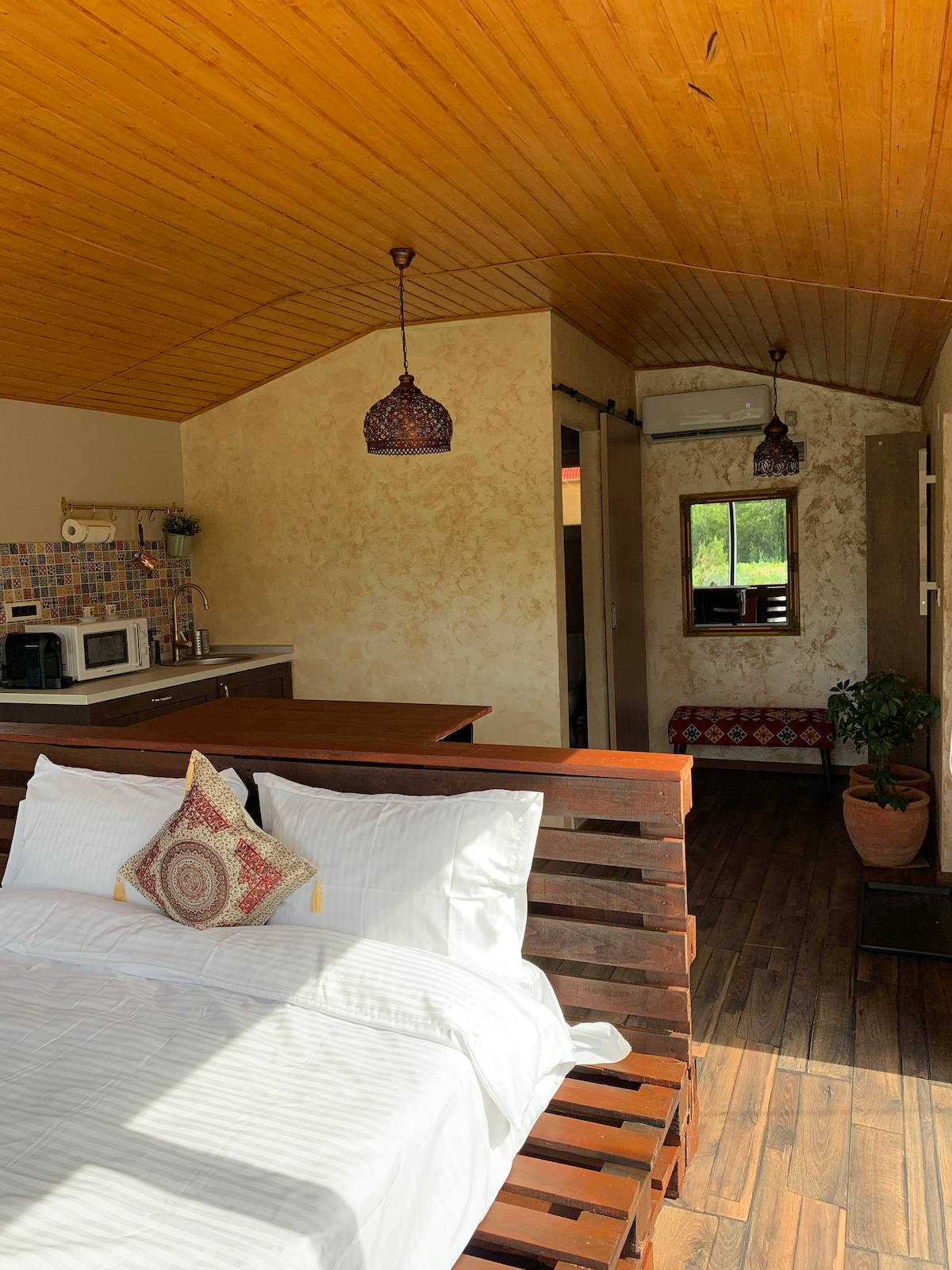 В мобильном коттедже могут разместиться от 2 до 4 человек ( количество человек выбрано из приложения ), в котором есть спальня с двуспальной кроватью размера King size и собственной ванной комнатой, оборудованной кухней, гостиной с очень удобным диваном-кроватью для 2 человек и собственной ванной комнатой. Перед коттеджем расположена терраса. 3 микродома расположены в том же дворе.