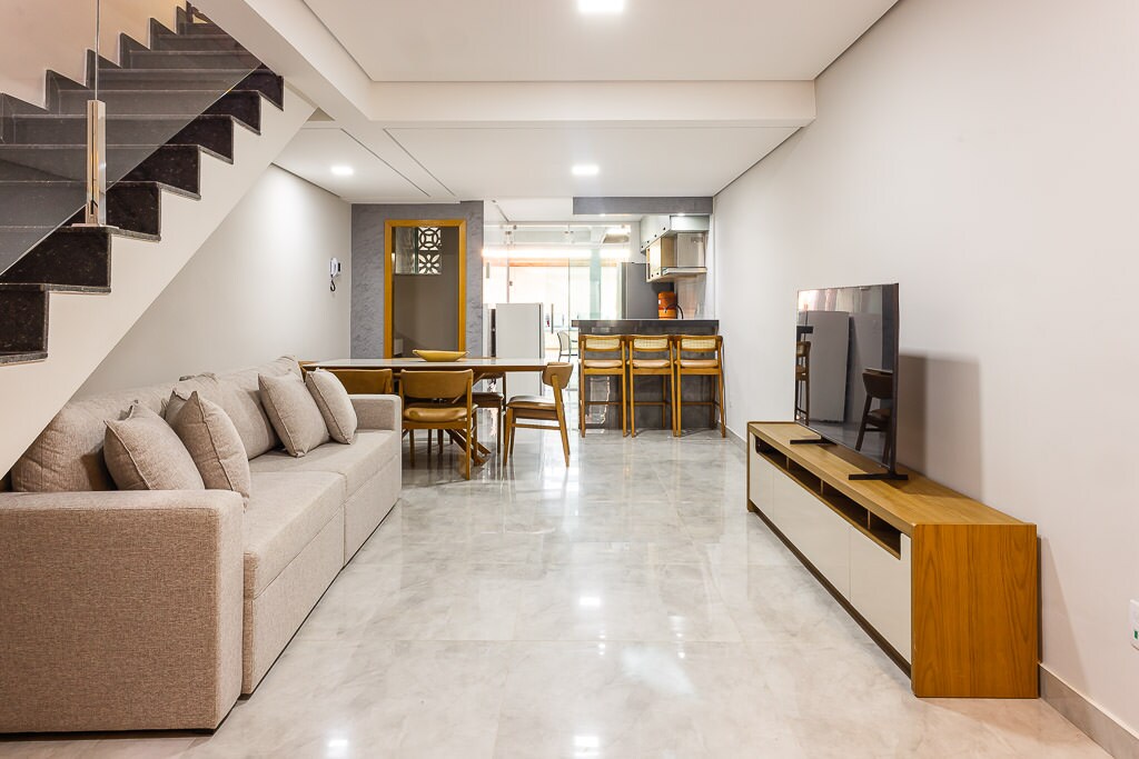 Отдохните в Casa Jardim Pampulha, уединенном месте в окружении зелени, комфортабельном и удобно расположенном. Площадь 80 м², вместимость до 6 человек, гостиная с кондиционером, Smart TV и диваном-кроватью, 2 спальни с собственными ванными комнатами и кондиционером (обогревателем), оборудованная кухня, объединенная с обеденной зоной, терраса, туалет и задний двор с садом, столом и настольным футболом. Вид на лес в зоопарке, парковка и розетка 220 В для электромобиля. 2 минуты от зоопарка и Коннектикута Америки и в 10 минутах от церкви Пампулья. Рядом с супермаркетом. Профессиональная уборка и доступный хозяин
