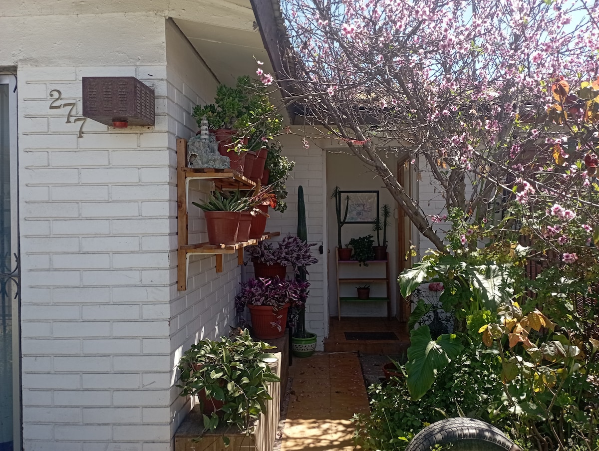 Уютный домик площадью 40 кв. м, 1 спальня, гостиная на 3 человек: Wi-Fi, кухня, отдельная ванная комната, отличное расположение, удобное расположение. Жилье расположено в тихом районе с низким уровнем шума, в нем есть простыни и полотенца, обстановка окружена красивым садом с различными растениями и кактусами, сектором со столом и грилем, частной и безопасной парковкой.