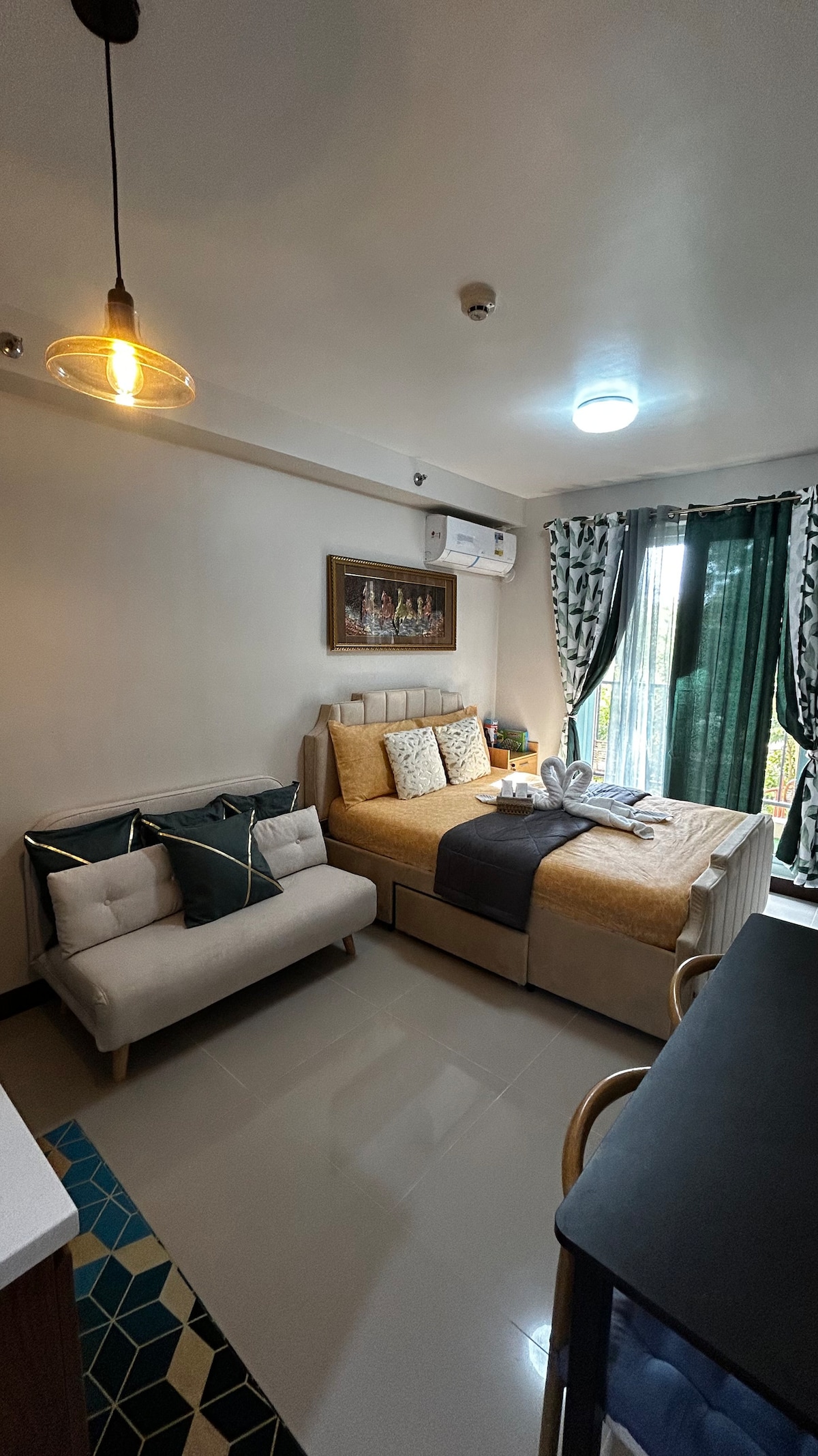 Удобная, доступная и эстетичная квартира-студия рядом с международным аэропортом Мактан-Себу Квартира площадью 24 кв. м с балконом Номер с двуспальной кроватью размера Queen size и видом на океан • может вместить 4-6 человек • предоставляется дополнительный матрас из пены и дополнительное одеяло. • бесплатный доступ к бассейну на двоих, платная парковка внутри; Ванная комната с: • душ, обогреватель, биде • шампунь | кондиционер | гель для тела • Полотенца Развлечения. • Подключение к Интернету со скоростью 200 Мбит/с. • Умный проектор 1080p 4K с объемным звуком. • Мини-караоке • Карточные и настольные игры