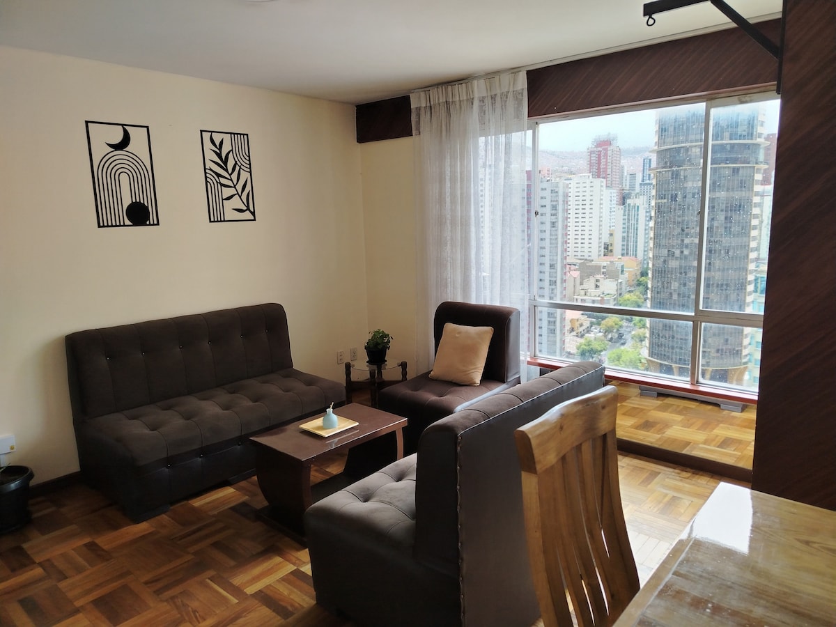 Просторно и уютно, с панорамными видами. Жилье расположено в центре Ла-Паса, в одном квартале от Прадо, в безопасном и вспомогательном районе. Полностью оборудованное жилье, есть все необходимое, чтобы сделать ваше пребывание приятным. С фиксированным отоплением в гостиной и газовой плитой, медицинское обслуживание. Отсюда легко добраться до основных туристических достопримечательностей, исторического центра, посольств, рынка ведьм, канатной дороги, ресторанов и магазинов. Почувствуйте магию Ла-Паса с лучшим видом и расположением в городе!
