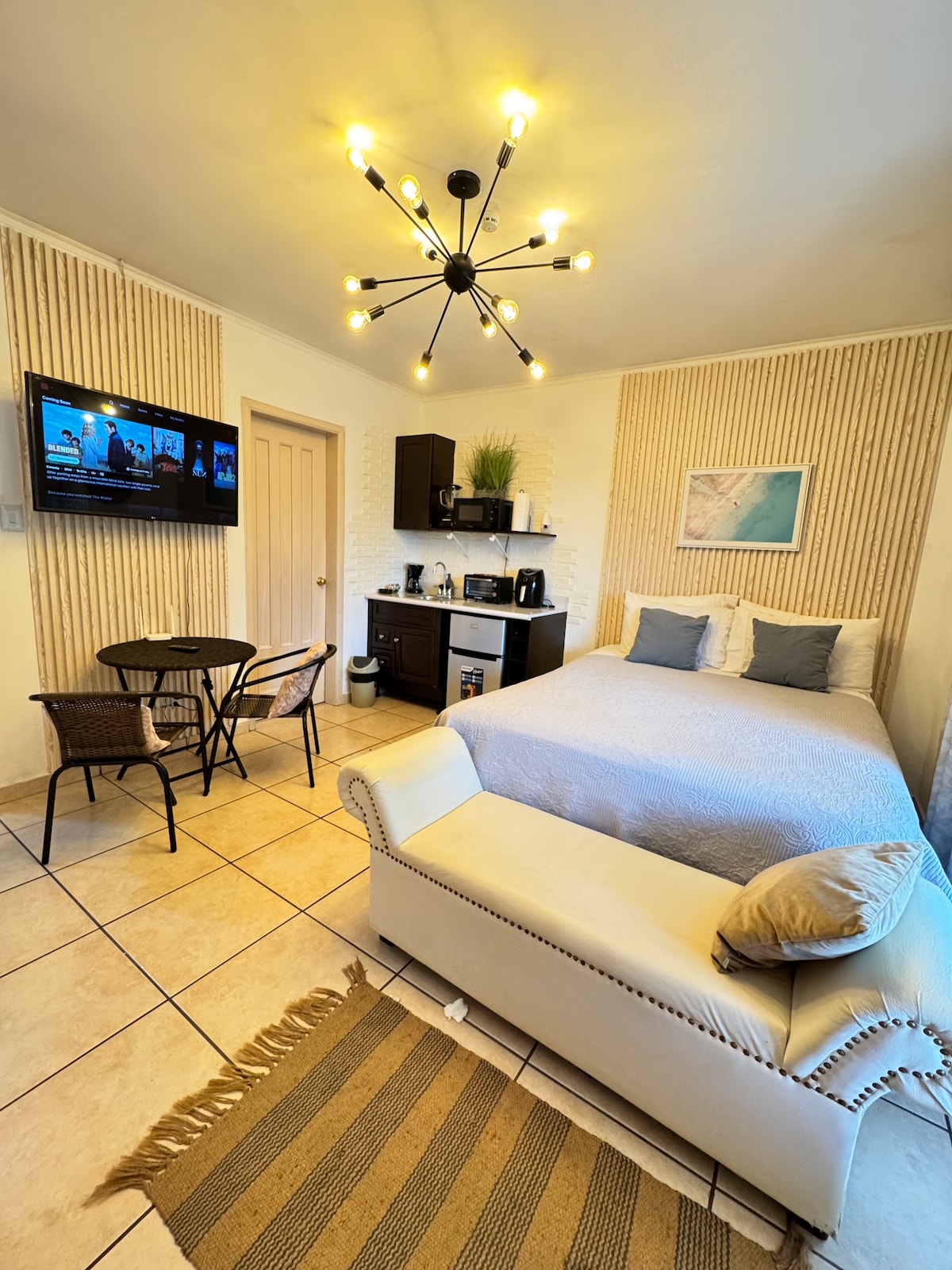 El estudio está muy bien equipado con todo lo necesario ideal para 2 personas que buscan un lugar tranquilo en buena ubicación Cuenta con una pequeña cocina, cama Queen size, área de trabajo, TV, baño privado. El estudio está en la segunda planta. 🎯▶️En Este Momento la Piscina se encuentra en Mantenimiento, por lo cual no está disponible 🚫 No es permitido las visitas. 👮Solicitamos imagen del ID 🪪 de acompañante. ⚡NO cuenta con generador eléctrico. Tomar en cuenta todos los reglamento.