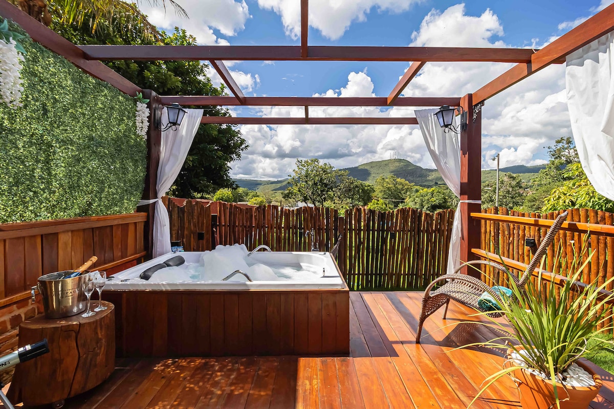 Шале Mirante do Sol Передайте незабываемые моменты тем, кого любите, в окружении природы и с захватывающим видом на лучезарный закат. Наше шале предлагает идеальный баланс между комфортом и романтикой. Наслаждайтесь полностью оборудованной кухней для приготовления пищи на двоих, полностью оборудованной гостиной, идеальной гидромассажной ванной, а также спальней и гостиной с кондиционером и уникальным видом. Здесь каждая деталь была продумана так, чтобы вы могли жить легко и соединиться с природой.