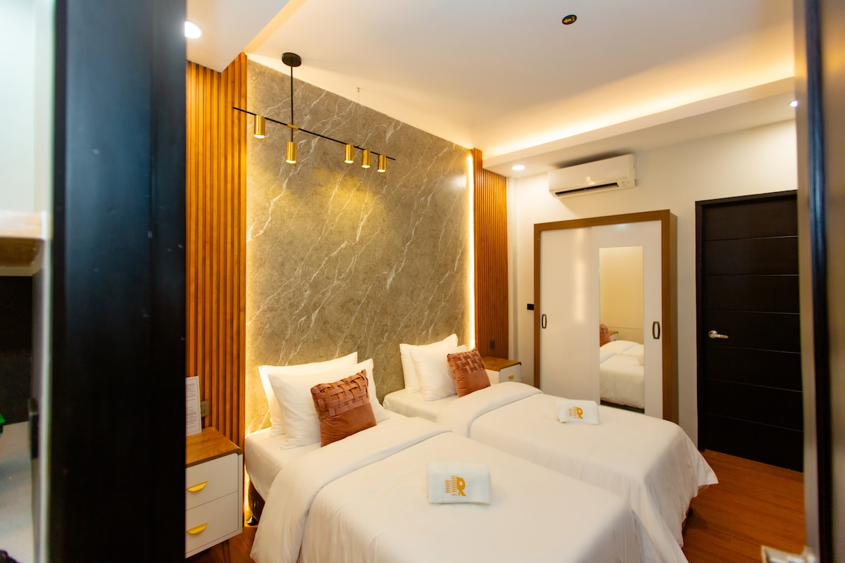 Our DELUXE ROOMS are perfect for travelers seeking comfort and affordability. These rooms feature cozy beds, modern amenities, and a welcoming ambiance includes a spacious lounge area, a mini bar counter and a separate bedroom with two twin size beds. Whether you're here for a short stay or an extended visit, our Deluxe rooms offer a comfortable retreat. The unit off 2 beds.