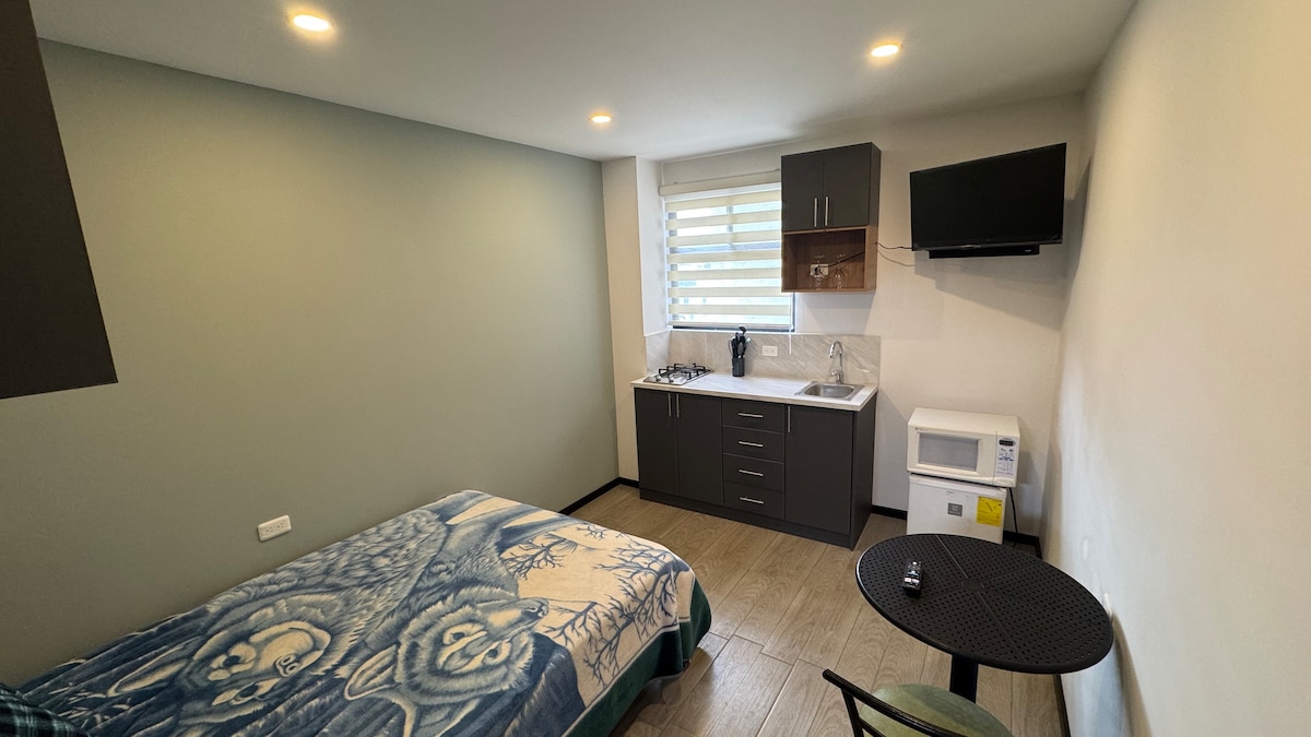 Наслаждайтесь современным, уютным и расположенным в центре города жильем в Латакунге. В этом жилье есть оборудованная кухня, собственная ванная комната, Wi-Fi, телевизор, гостиная, столовая и удобная комната, идеально подходящая для отдыха. В нескольких шагах от исторического центра, отдельный вход. Идеально подходит для тех, кто ищет комфорт, уединение и хорошее расположение, есть парковка для небольших транспортных средств, если ваш автомобиль большой, есть очень безопасная общественная парковка в 20 шагах.