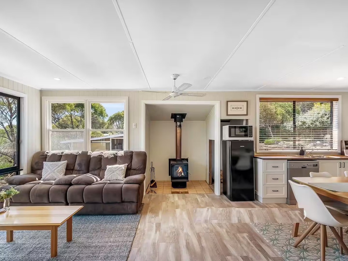 Boasting water views from almost every room of the house, Bushy Summers is a waterfront retreat in the beautifully secluded town of Lettes Bay. Originally an old miner’s shack, Bushy has been lovingly restored using found and up-cycled treasures to craft a beautifully bespoke and nurturing home. Light, bright and cosy, it is full of beautiful linen textures and wonderful character. If you’re looking for a peaceful escape with amazing views, this is it.