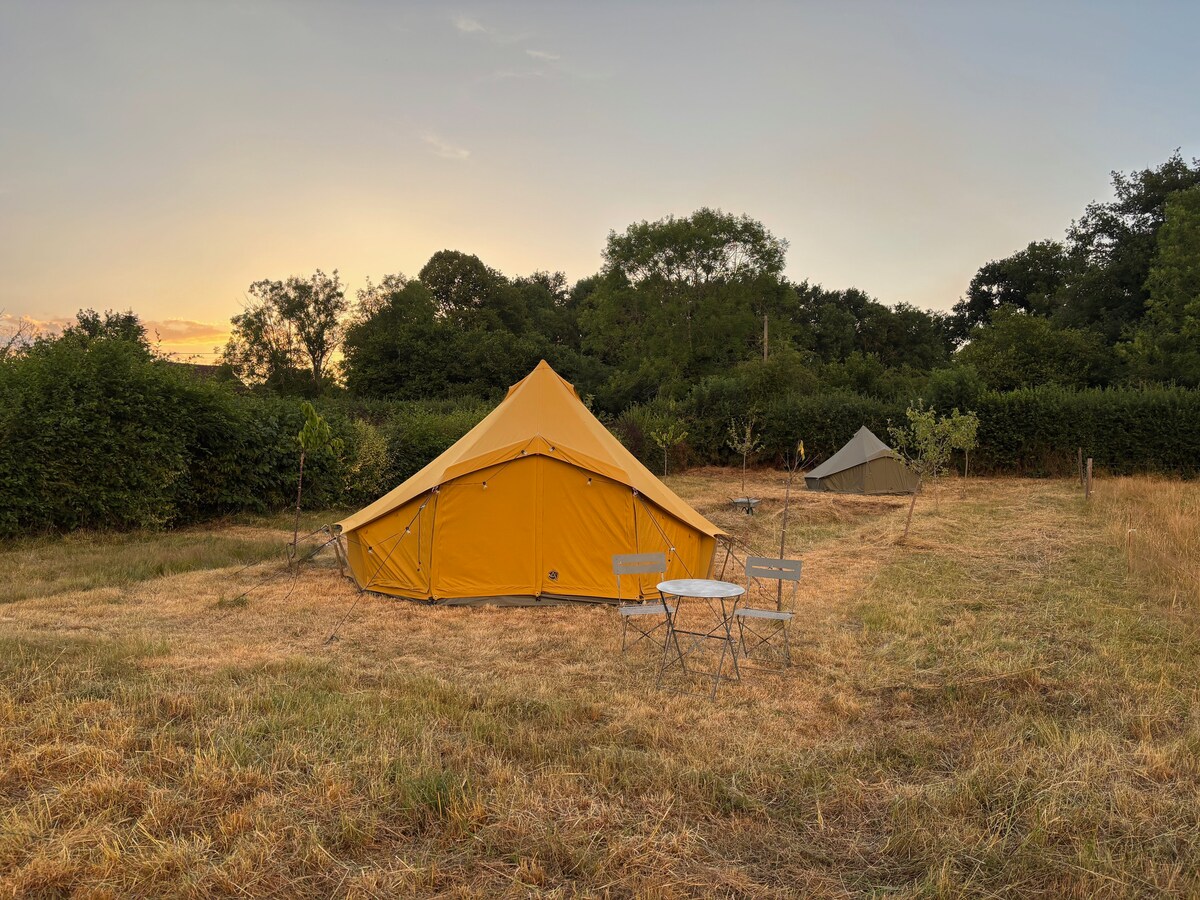 У нас есть 2 прекрасные палатки для глэмпинга. Вся территория в вашем распоряжении, и вы не будете делить удобства с другими гостями. Вы можете забронировать 1 палатку (2–3 человека) или 2 палатки (4–6 человек). Если вас больше 6 человек или у вас есть вопросы о детях, младенцах или о чем-либо еще, свяжитесь с нами, мы можем помочь. Из палаток открывается вид на сельскую местность, они расположены среди фруктовых деревьев. У вас будет собственный доступ к полноценной кухне, ванным комнатам, бассейну и крытой зоне отдыха.