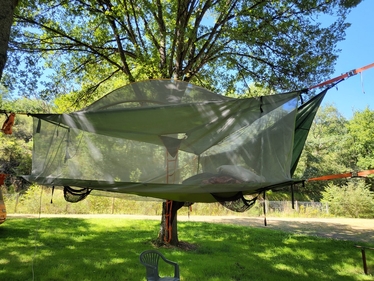 Не бойтесь спать в палатке, висящей на наших высоких деревьях! Это гигантский гамак для 3 человек! Внутри вы найдете одеяла, подушки, лампу и розетку. Если позволяет погода, вы можете спать с видом на звезды, защищая от москитной сетки.