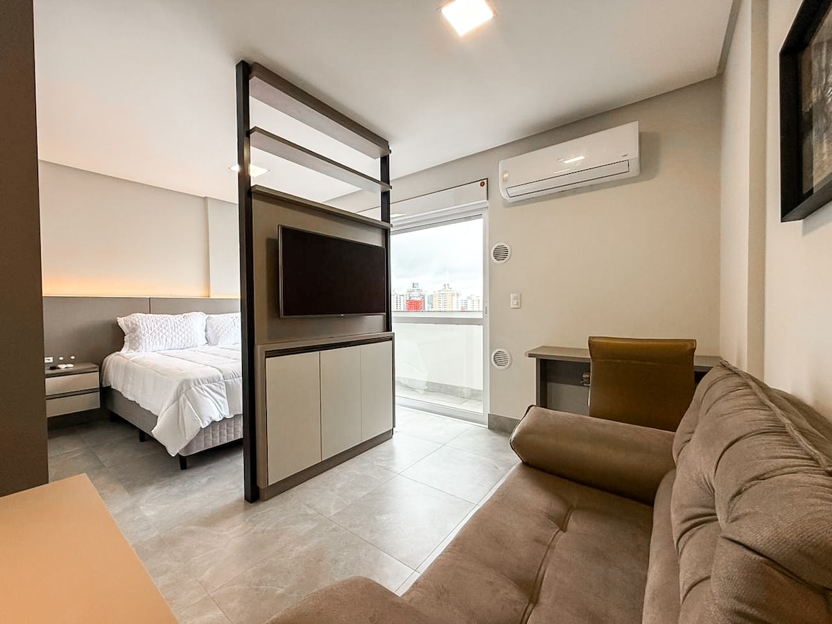 Apresento a você um studio moderno, prático e totalmente mobiliado, localizado no HUB Smart Home, estrategicamente no centro de Criciúma. SOBRE O STUDIO O studio é todo mobiliado, equipado e fica a poucos metros de supermercados, farmácias, lojas, hospitais e restaurantes. Trazendo toda a praticidade e conforto que você procura. SOBRE O HUB O edifício é todo automatizado - feito para Airbnb. Nele você tem acesso a academia, área de coworking 24hrs, lavanderia, mercado autônomo e bicicletário.