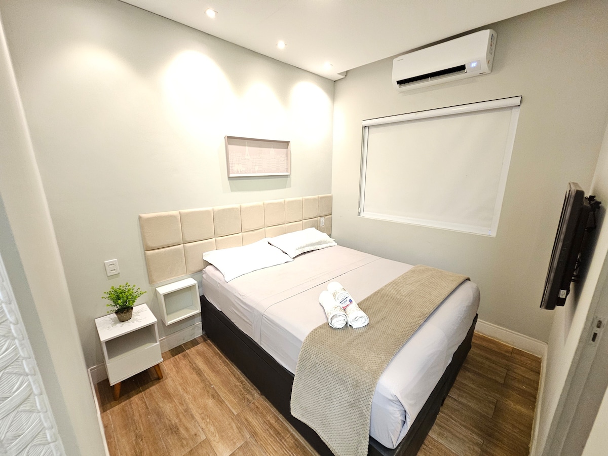 Эксклюзивный вход в торговый центр Balneário (через здание). Бассейн, тренажерный зал, прачечная (оплачивается через приложение). Частный гараж. О квартире: — 2 спальни (люксы) с двуспальной кроватью размера Queen size, газовым душем и горячей водой во всех кранах, кондиционером. — Комната: 50-дюймовый телевизор Smart TV. — Кухня: полная, угольное барбекю. — Включает фен и утюг. - Есть ванная комната. Высокоскоростной Wi-Fi.