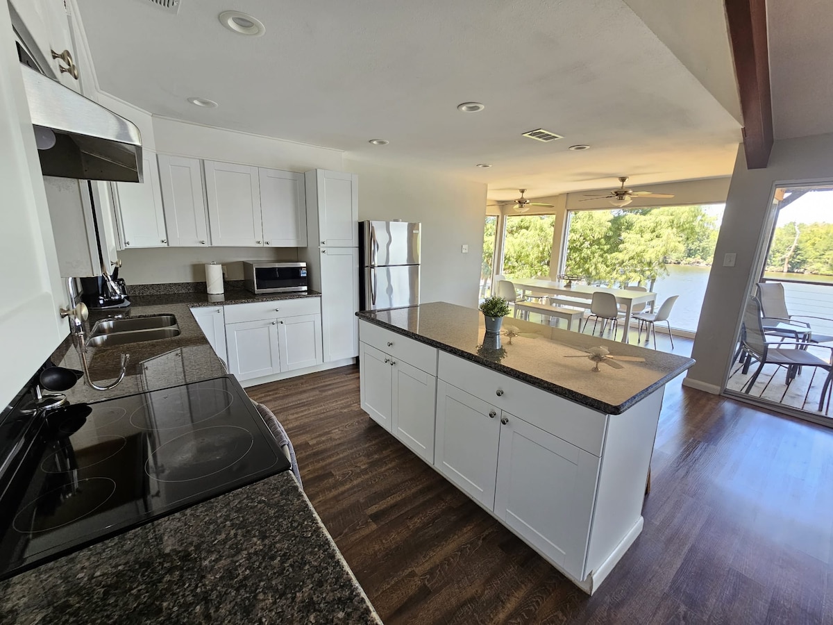 Расслабляющий дом на набережной с лучшими закатами на озере Хьюстон. Обновленный современный деревенский дом с открытой гостиной и большой террасой, идеально подходит для качественного времяпрепровождения с семьей или дружеской. Полностью укомплектованная кухня с бытовой техникой SS, льдогенератором, холодильником для напитков, винным холодильником и огромным кухонным островом. Рыбалка или плавание с длинного причала с лестницей в воду и ополоснитесь в душе на открытом воздухе. Телевизоры SmartTV предоставляются во всех спальнях и гостиной с колонками объемного звука в жилых помещениях и на открытом воздухе.