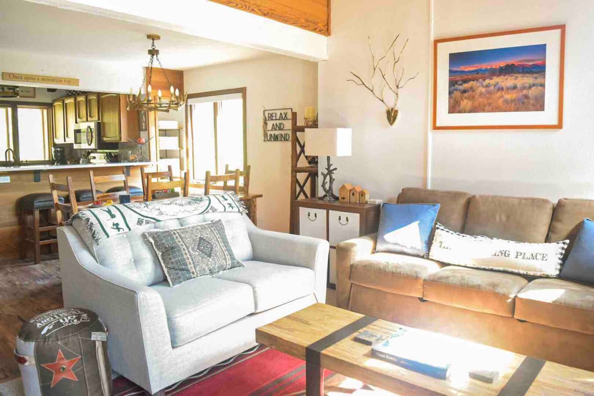 Это просторное, светлое и отремонтированное кондоминиум 1bd 1ba в комплексе Sunrise вмещает 4 человека и является идеальным местом для отдыха после изучения всего, что может предложить Mammoth Lakes. Наслаждайтесь кофе в частном патио с видом на Sherwin и расслабьтесь в сезонном бассейне и/или гидромассажной ванне, прежде чем остыть на диване рядом с камином. Есть много места для парковки прицепов и хранения вашего снаряжения, независимо от того, посещаете ли вы лыжи, велосипеды, рыбалку, пешеходные походы, гольф или катаетесь на лодках.