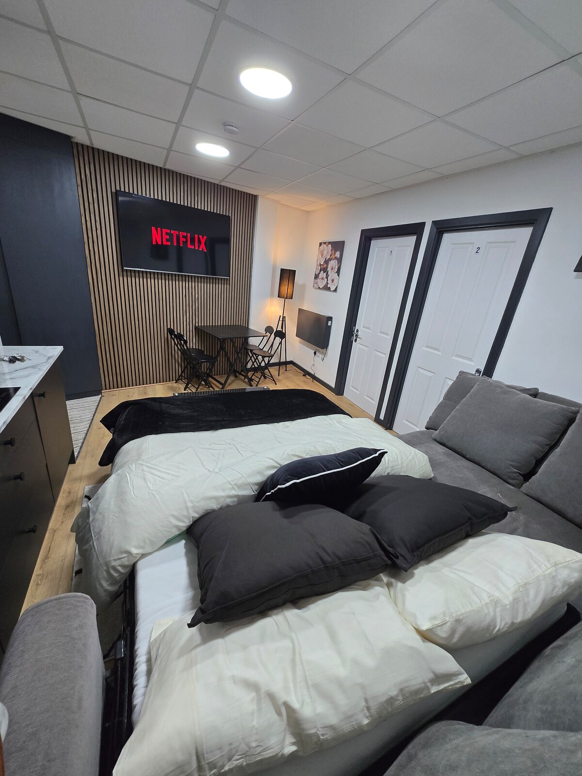 Just an 8 minute drive into Manchester city centre! A high-spec studio designed to host leisure and work travellers. With hotel quality zip-link beds sleeping two guests (note: three quarter bed). Space comes with a TV and FREE wifi, fully equipped kitchen, including washing machine and built-in fridge. A modern, private bathroom with a walk in shower. Dining area; perfect for those travelling for work purposes. FREE street parking available.