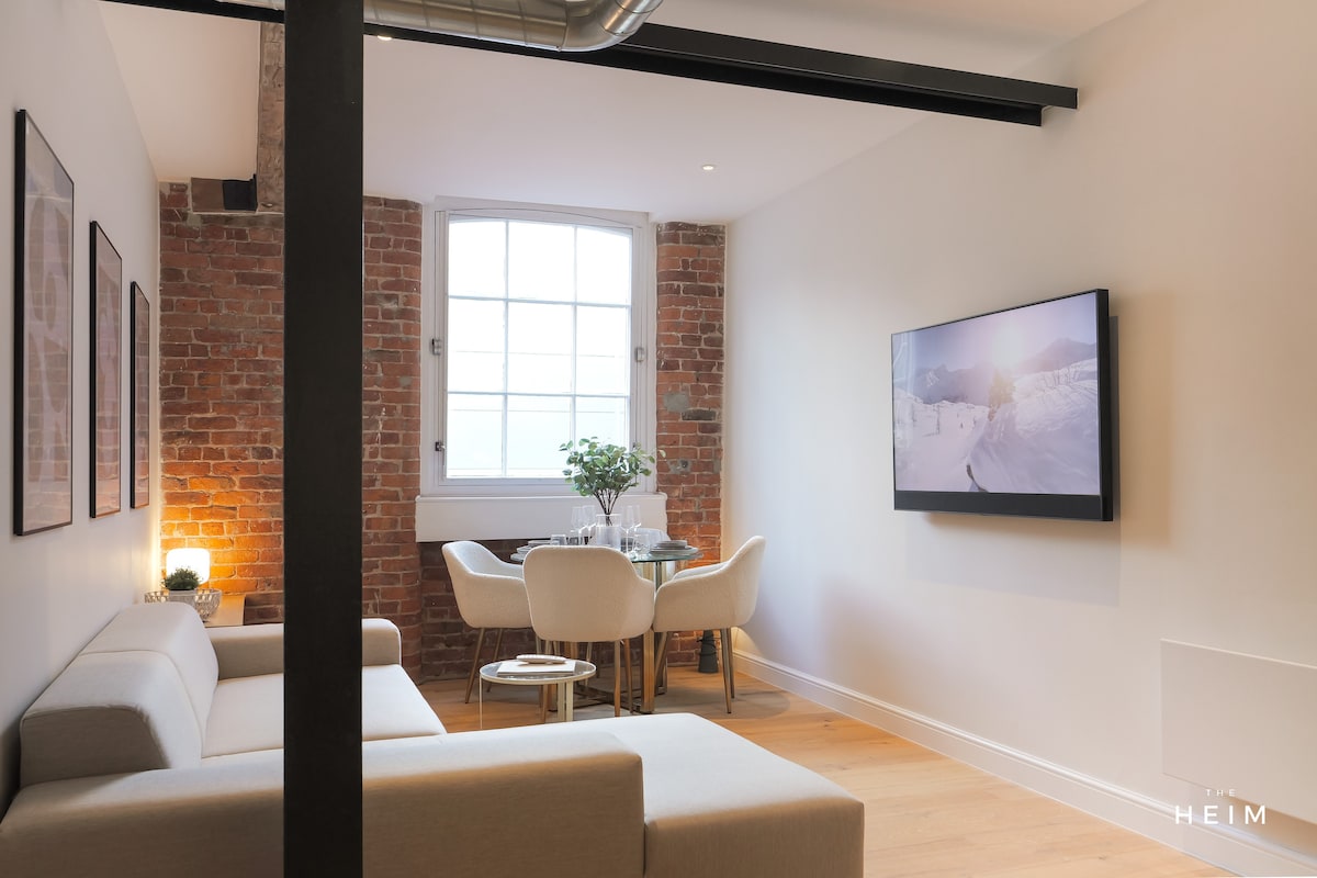 Welcome to Aria! - Spacious 2BR converted mill apartment with modern design. - Open plan living with flat-screen TV and high-speed free WiFi. - Close to iconic landmarks like the Cathedral, Arndale Shopping Centre and National Football Museum. - Enjoy the Nespresso machine and pods, tea, coffee, sugar, toiletries, towels and cleaning boxes provided for convenience. - Perfect for families and long-term stays.