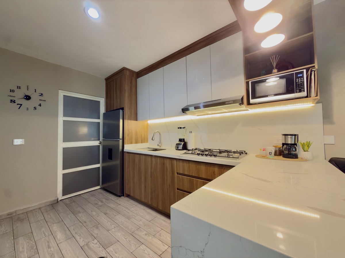 Новая квартира на первом этаже перед бассейном в отличном месте, недалеко от Аэропуэрто, больницы Анхелес, площади Сейба и Costco: - Две спальни: главная с двуспальной кроватью размера Queen size, вторая с двуспальной. - оборудованная кухня; - Телевизор 4K 55”. - Полноценная ванная комната. - бассейн, столики на открытом воздухе и коворкинг; - Подсобное помещение со стиральной машиной и сушкой. Наслаждайтесь комфортным и удобным отдыхом. Ждем вас!