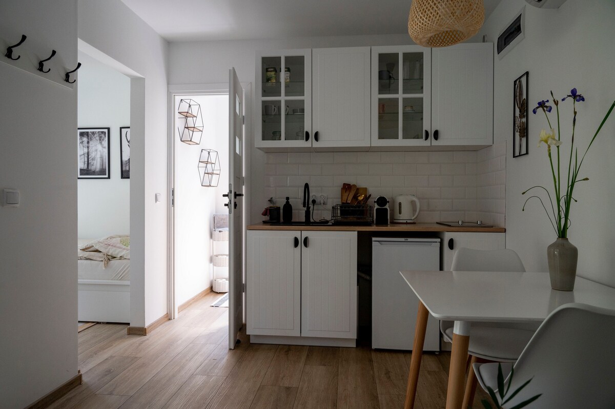 Кому нужна жесткая перезагрузка, зеленый детокс и отключение от повседневности! Деревянный дом в 35 км от Варшавы, стоит на 1500-метровом участке, рядом с лесом, рядом с лесом. 40-метровое пространство, наполненное комфортом и скандинавской жарой, мы создали для 4 человек. У вас будет одна спальня с двуспальной кроватью, гостиная с кухней и диваном-кроватью, ванная комната с душем. Для нас вы можете отключиться от всего остального мира и провести несколько дней в медленном темпе!