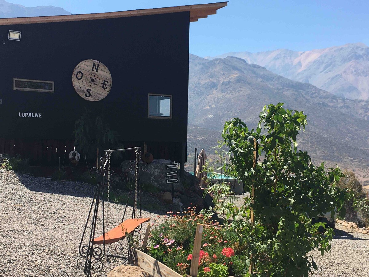 Refugio privado y exclusivo con vista privilegiada a la Cordillera de los Andes. Ubicado en total silencio y rodeado de naturaleza, sin casas cercanas. Cuenta con piscina de nado y tinaja (Hot Tub de uso exclusivo de la cabaña), gran quincho y espacios totalmente equipados. Sustentable, cómodo y pensado para desconectar. A 20 min del Casino Enjoy, 60 min de Portillo y 1 hora de Santiago.