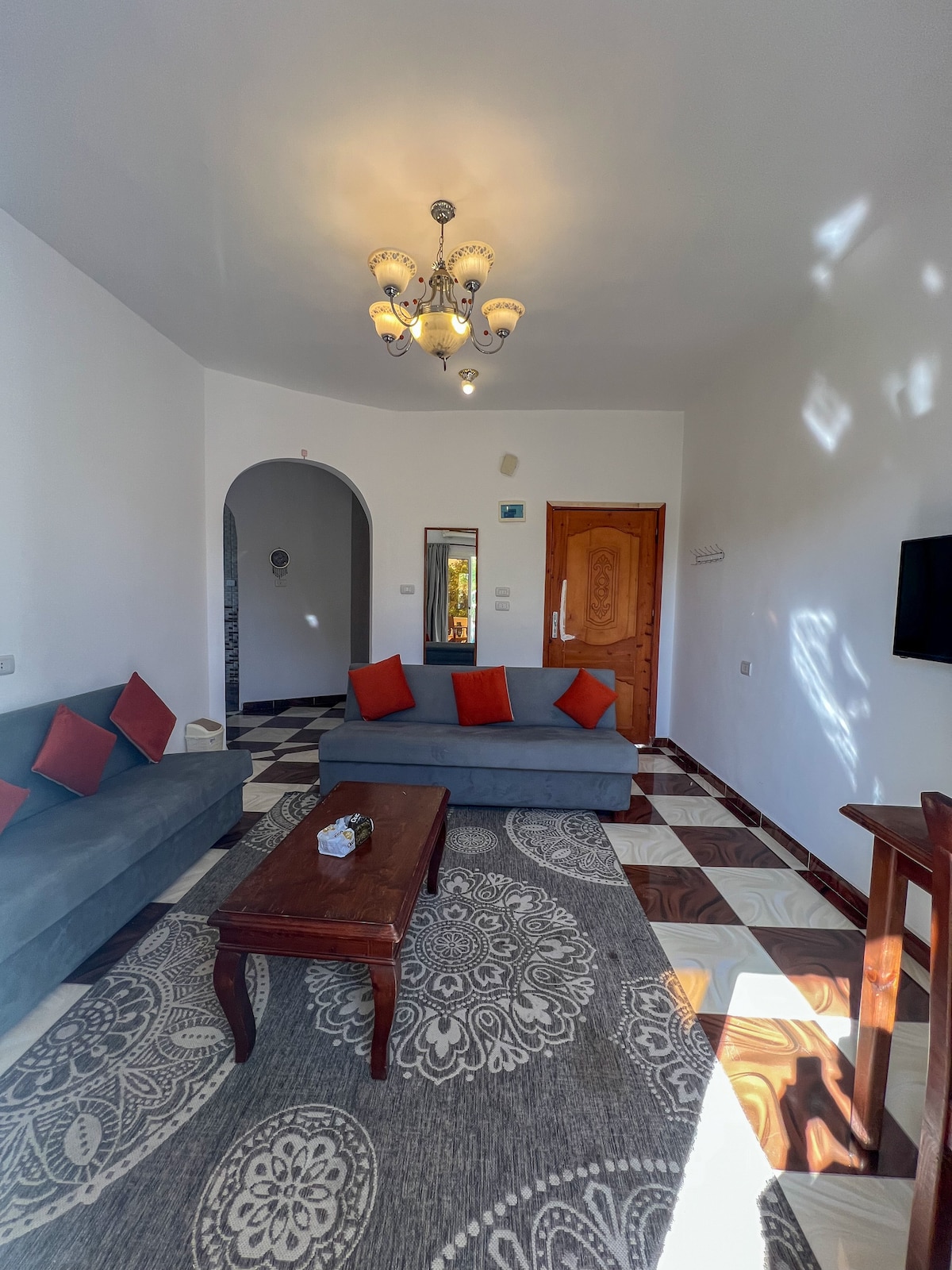 Эта уютная квартира расположена в районе Eel Garden в 1 минуте ходьбы до пляжа. Красивая спальня с кондиционером и большим окном с видом на сад и пальмы. гостиная с диваном и полностью оборудованной кухней красочная и современная ванная комната огромный удобный общий сад, полный пальм и деревьев, крыши с видом на море, чтобы насладиться и расслабиться в течение дня или вечером, чтобы понаблюдать за звездами, недалеко от всего, что вам понадобится в Дахабе, но это очень тихий район, предлагающий всем моим гостям расслабляющий отдых.