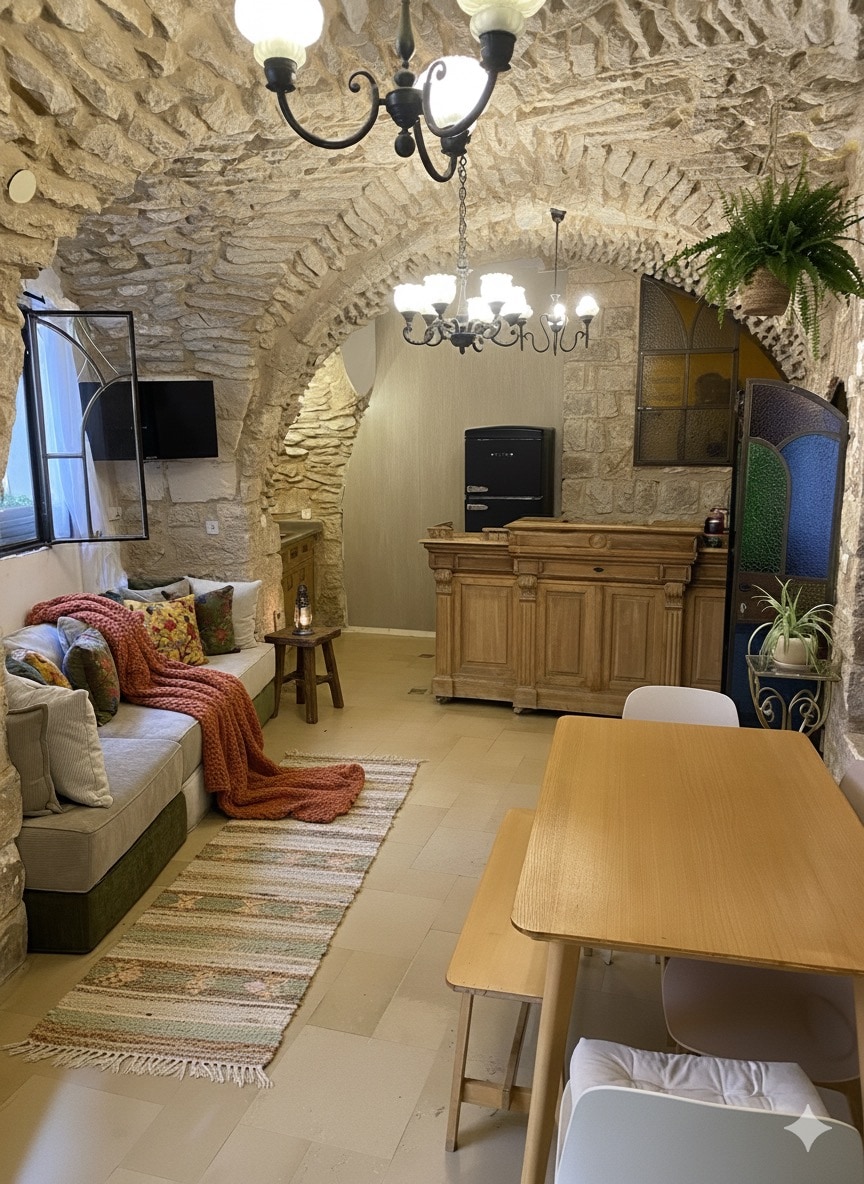 A bright and beautiful stone house made of local stone with 9 artistic arches and a bathroom built of mud and earth, The house is located in an off grid vilage- Kadita - it is an ecological residence. The electricity in the stone house is produced by a solar system. In addition, there is a water recycle sistem directed to the trees in the orchard. We offer users to throw their food scraps into the compost bucket, which we recycle to produce fertile compost soil.