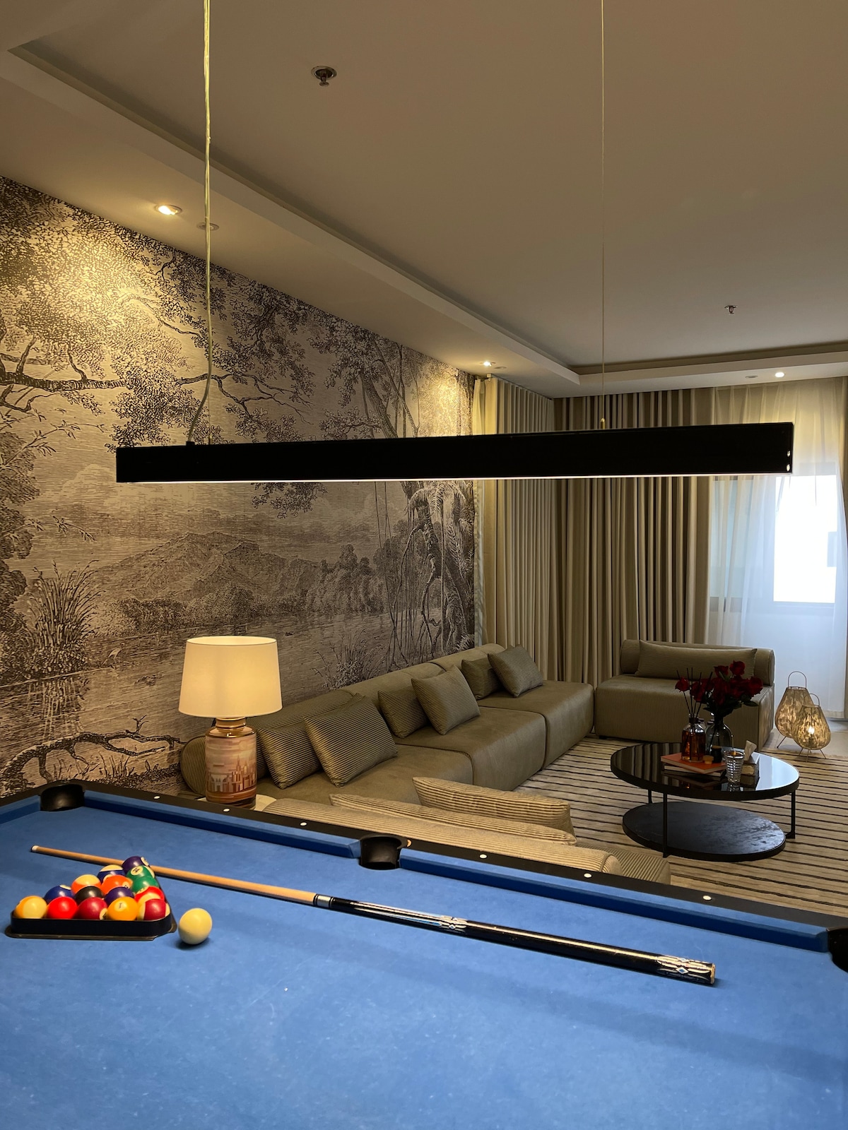 Роскошная студия с прямым видом на мост Бахрейна и море, стратегически расположенная рядом с торговым центром Shubaili Mall. Дизайн элегантный и тихий, с теплыми цветами и сбалансированным освещением, которое создает ощущение стильного отеля. Спальная зона оборудована роскошной кроватью и современным декором, с деревянной перегородкой, которая обеспечивает уединение и высокий дизайн. В комнате удобный кожаный диван и меховые акценты, которые добавляют теплоту этому месту, а также аккуратная рабочая зона со светодиодным зеркалом и комнатные растения, которые придают дух и изысканный характер. Жилье идеально подходит для тех, кто хочет комфорта, уединения и высокого вкуса для небольшой семьи и путешественников, ищущих другое жилье и близко ко всем услугам