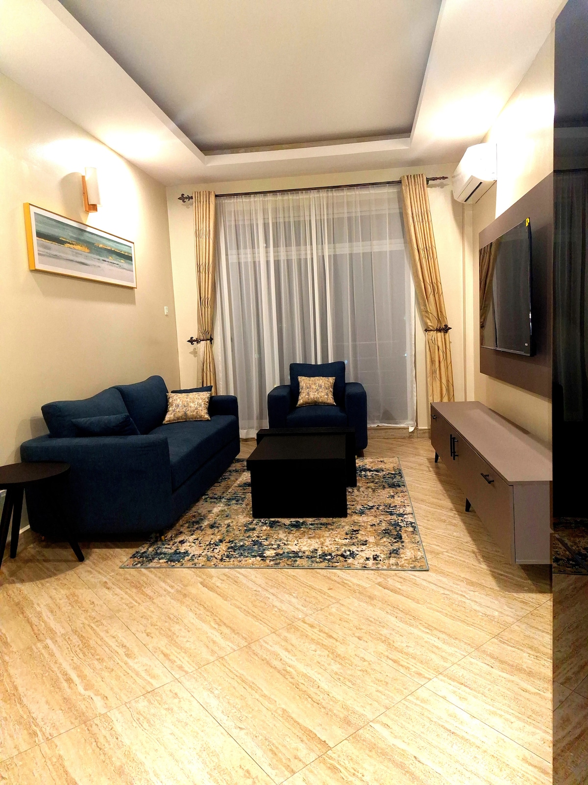 This is 1 bedroom apartment with a separate open kitchen-living room concept layout that offers much needed privacy especially for couples. The premises is located in a safe area within reach to many essential places in Dar, such as Mlimani City, city center and Masaki. The unit is well furnished with modern amenities including a washer, reliable WIFI, 55’ inch Cable TV, AC and many more. There is a secure parking for free as well as a nice garden landscape outside for relaxation.