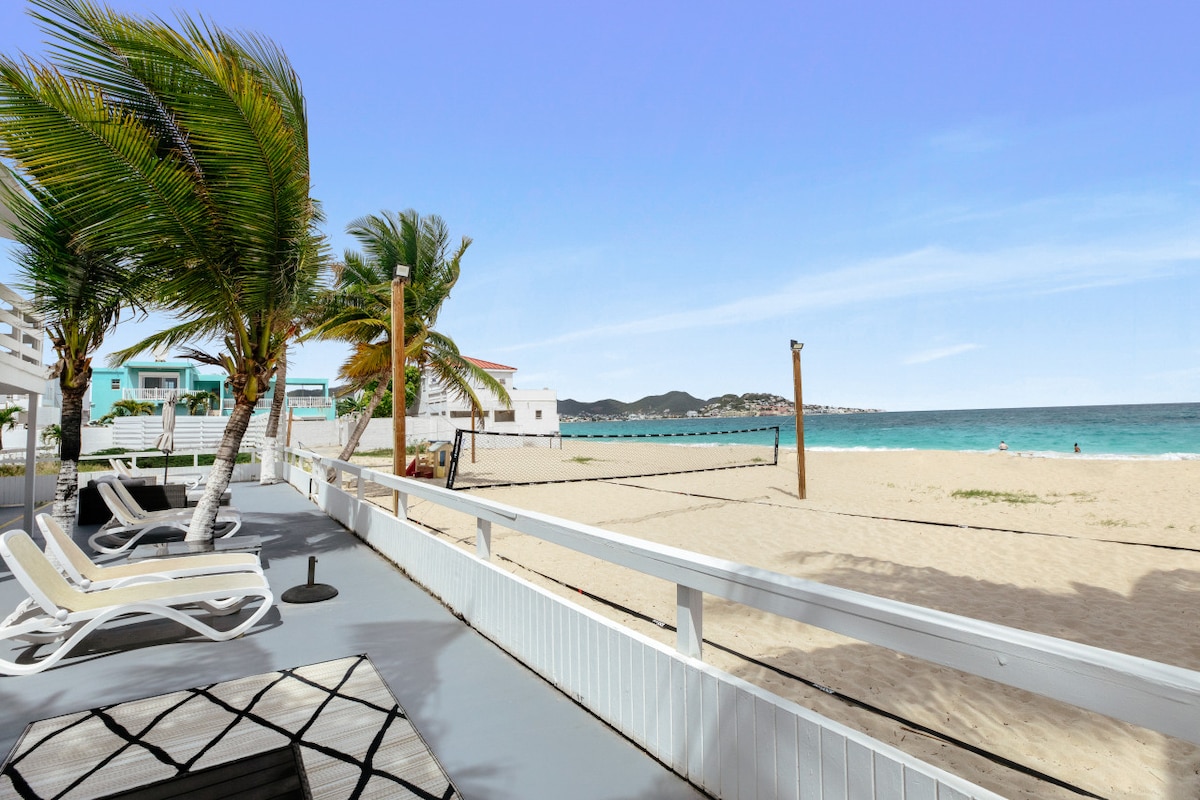 Просторный люкс Deluxe Condo с мраморными полами, полностью оборудованной кухней с гранитными столешницами и большим балконом из итальянской глиняной плитки с видом на Атлантический океан и французский Сент-Бартс в хорошо известном отеле на Дон-Бич.