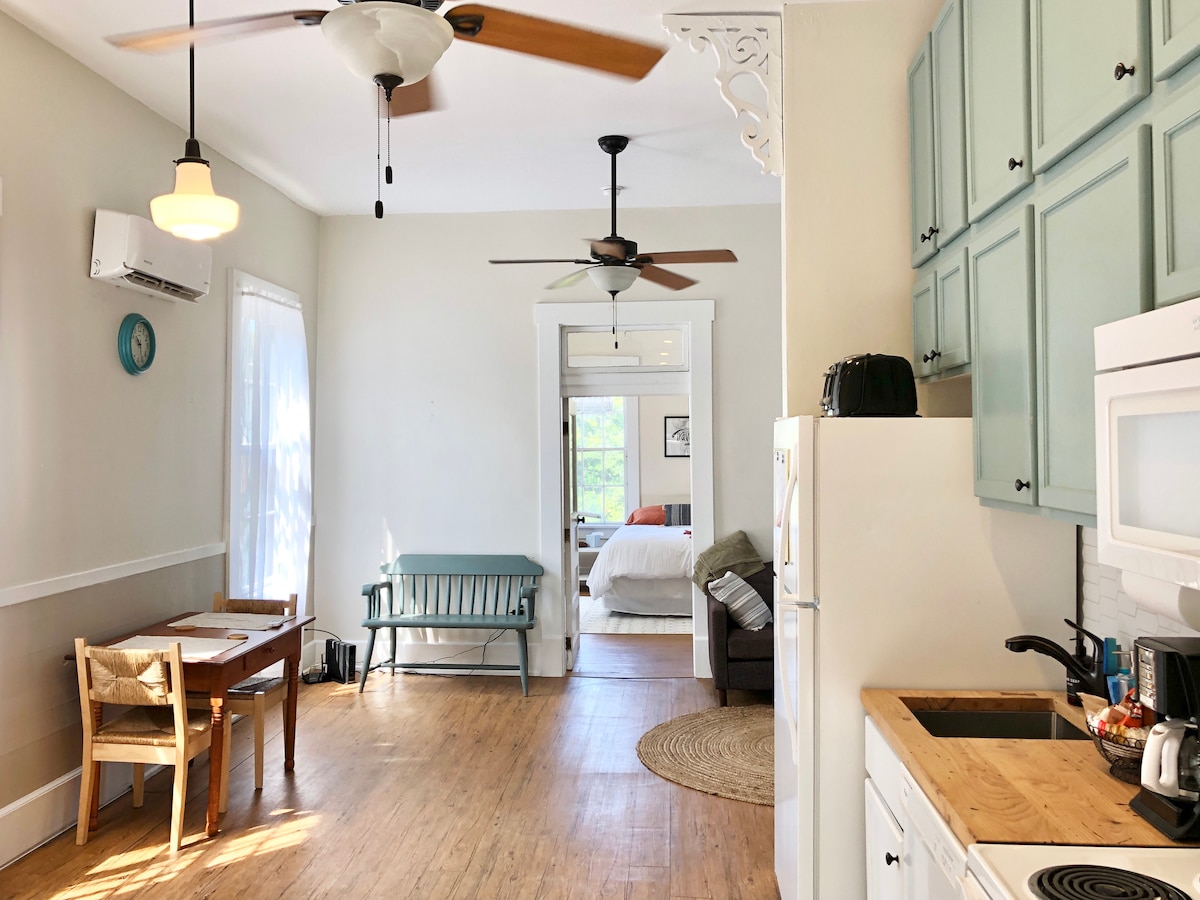 Исторический гостевой дом South Park Purple Barney. Построенный в 1920 году этот коттедж с дробовиком был восстановлен мной, местным активистом, который снял его с пальцев. Вы найдете сочетание исторического, современного и современного стиля середины века со сводчатыми потолками, мансардными окнами в спальне и просторной ванной комнате, а также безопасным, уютным и тихим благодаря изоляции, новым окнам и дверям. Новая металлическая крыша в 2022 году Хозяин - сертифицированный ветеринар с ограниченными возможностями.