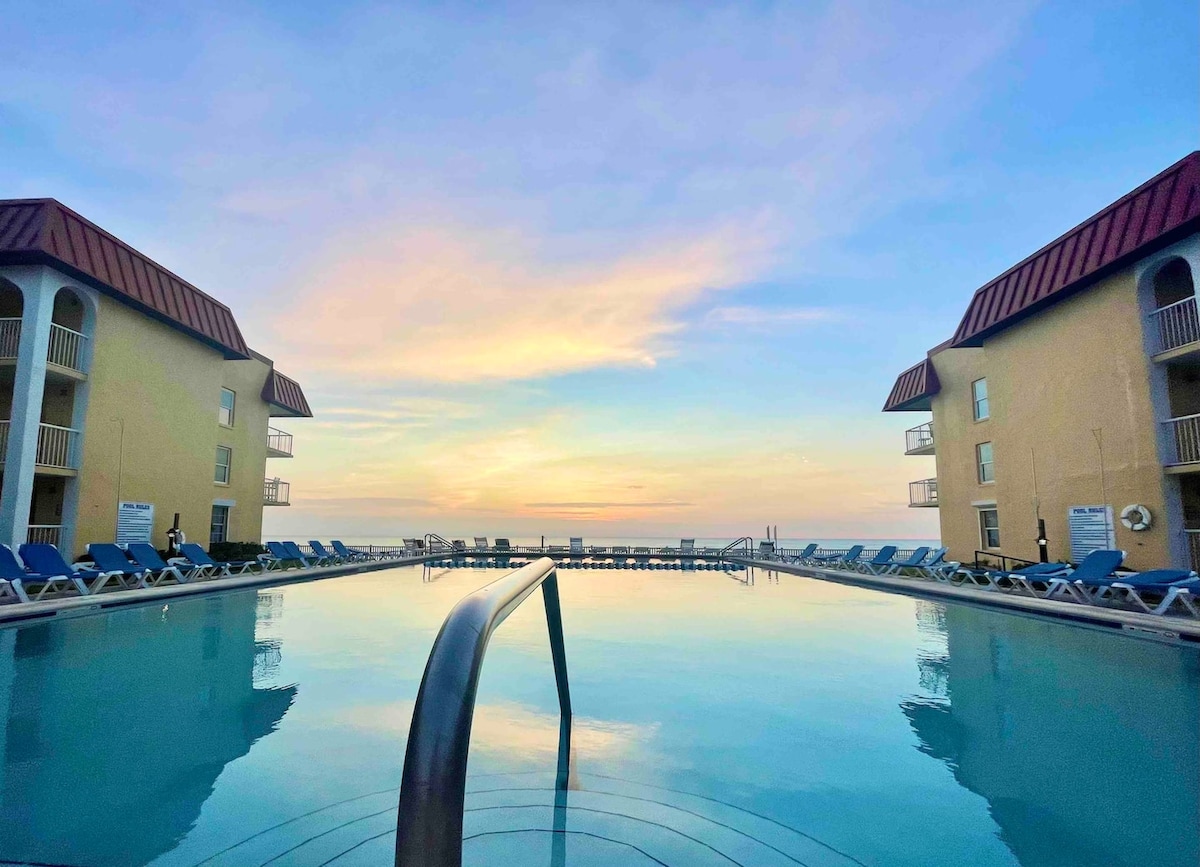 DIRECT BEACH ACCESS! Come and RELAX in this CLEAN cozy beachside retreat. Updated with NEW kitchen and bathroom! Heated Pools are right outside the door and just steps to the beach. Enjoy the sunrise and great view of the ocean right from your first floor condo! Relax here at the beachfront Ocean Jewels Club and enjoy pool beach time or walk to Crabby Joes, Main Street or the Clam Shell. Watch the fireworks from your patio area. On-site Adams Egg restaurant. What's not to like!! ENJOY