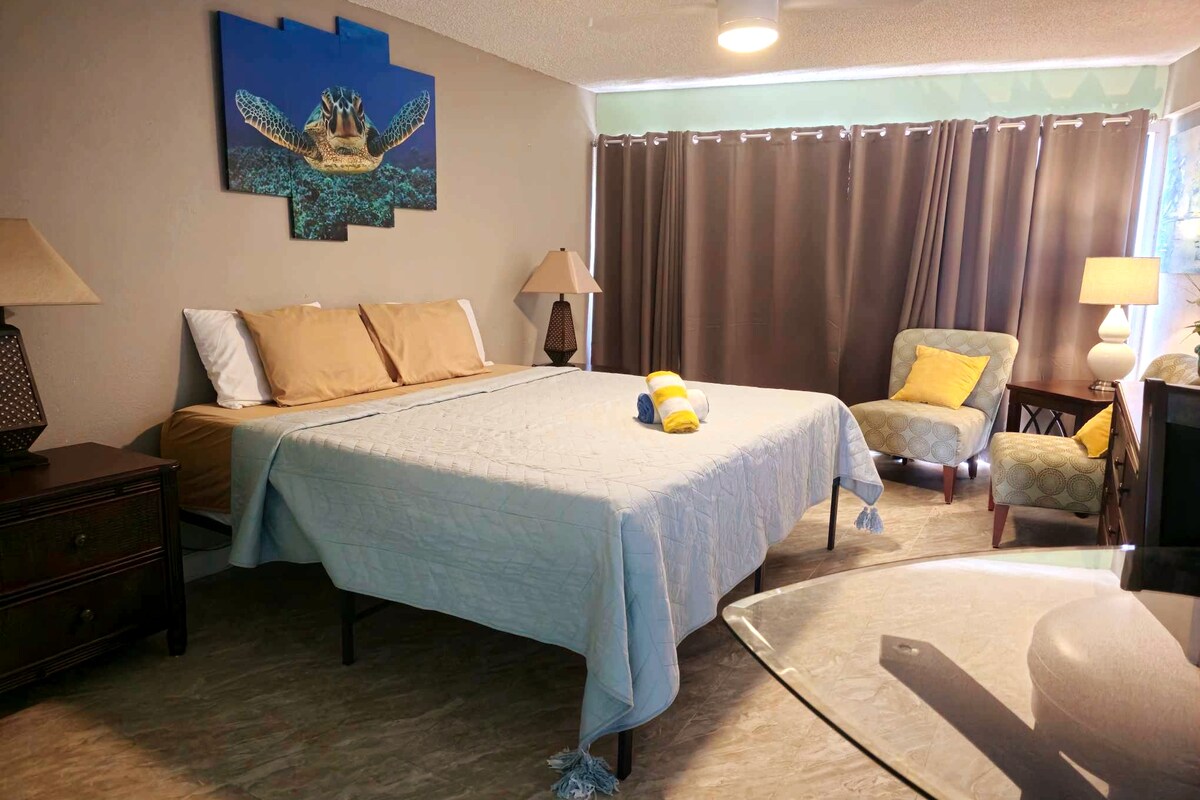 Кондотель с ОДНОЙ спальней прямо на пляже! В спальне установлена кровать размера King size, а в гостиной — раскладной диван размера Queen size. Квартиры находятся в частной собственности и управляются ТСЖ. За последние несколько лет мы внесли много улучшений в это первоклассное жилье. Наше здание находится в центре всего. Вы не будете разочарованы! Я буду рад принять вас, вашу семью или вашу возлюбленную. Если у вас появятся вопросы, напишите мне. До скорой встречи на прекрасном 🏖️пляже Дайтона!