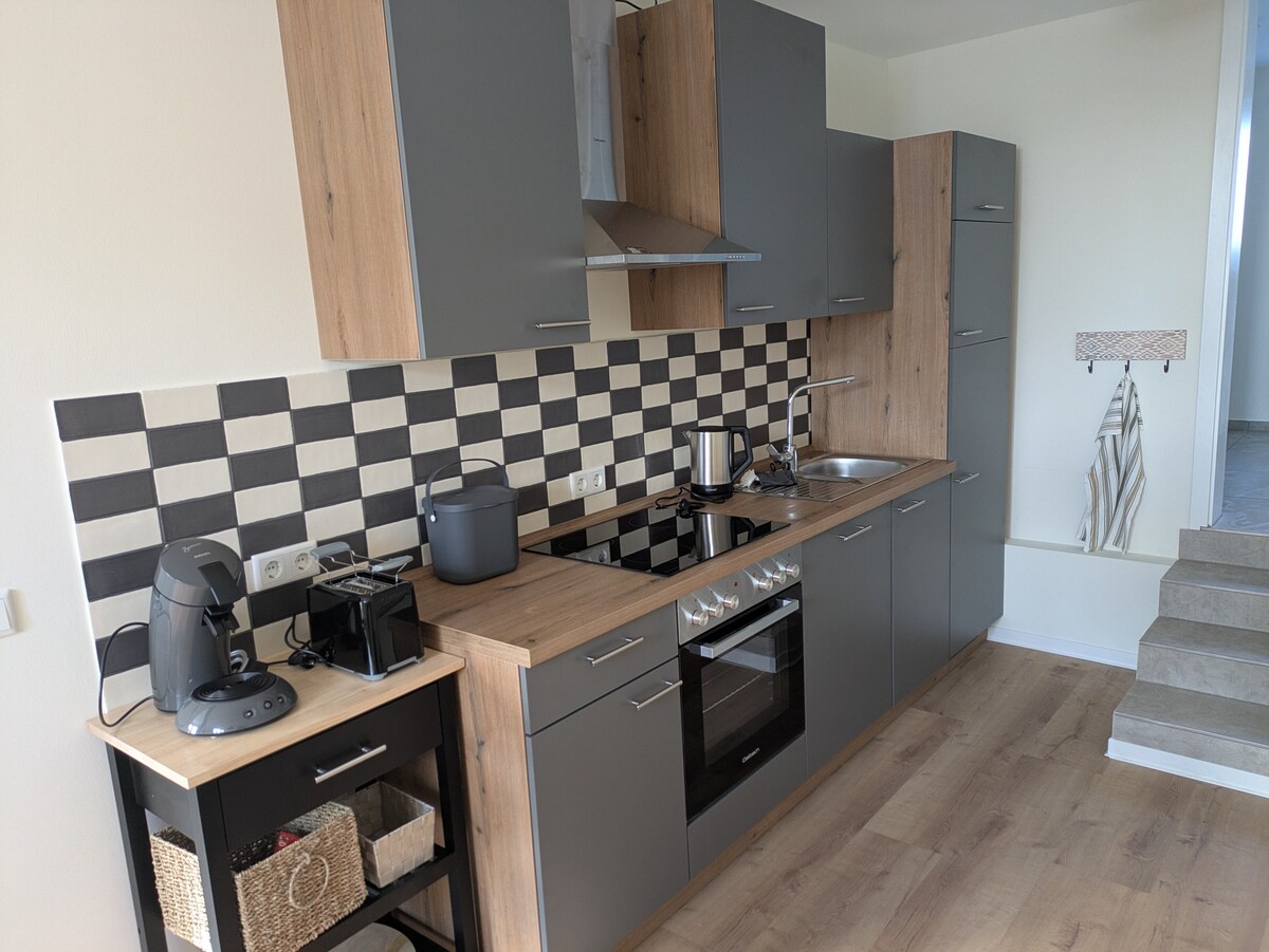 Sunny apartment close to downtown with a terrace in a quiet and preferred residential area with free parking. The newly renovated holiday apartment can accommodate up to 6 guests comfortably with two rooms with posibility to sleep. The apartment offers a fully equipped kitchen. Suitable for vacation, hikers, visitor accommodation, seminar participants, fitters and craftsmen. Work is also possible: Fast Internet with LAN/WLAN, posibility to print. Welcome!