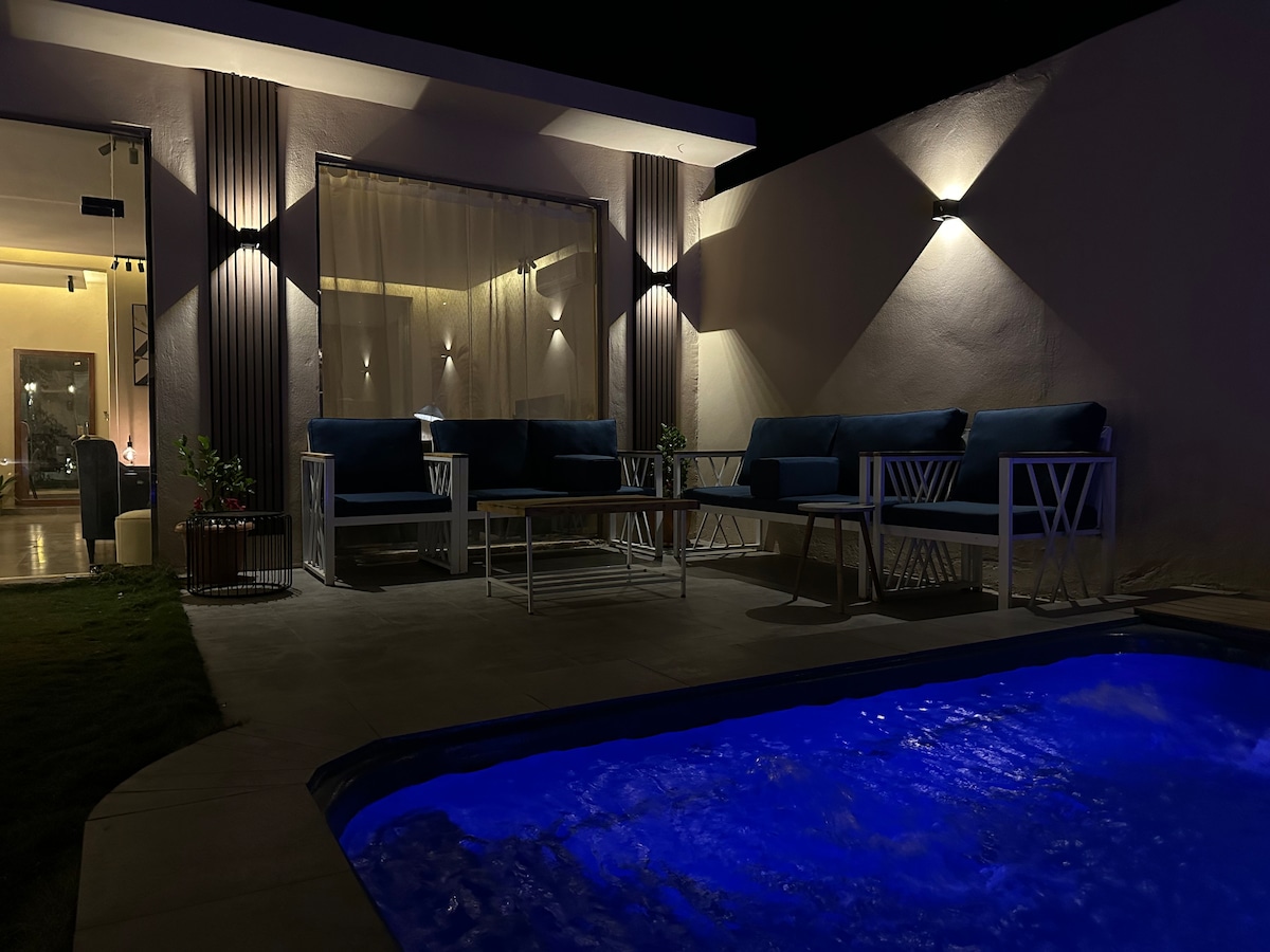 Неповторимые впечатления в горах Тувайк в районе шале Дераб в конюшне, а также возможность 45-минутной верховой прогулки за дополнительную плату. Новое шале Услуги / Бассейн и водопад с регулируемым освещением и спальня с видом на бассейн и умным экраном Зеленая зона с сеансом на открытом воздухе с зонтиком и обогревателем И гриль. И доска со смарт-экраном и оборудованная кухня и ванная Интернет Время заезда: 14:00. Время выписки: 10:00 следующего дня