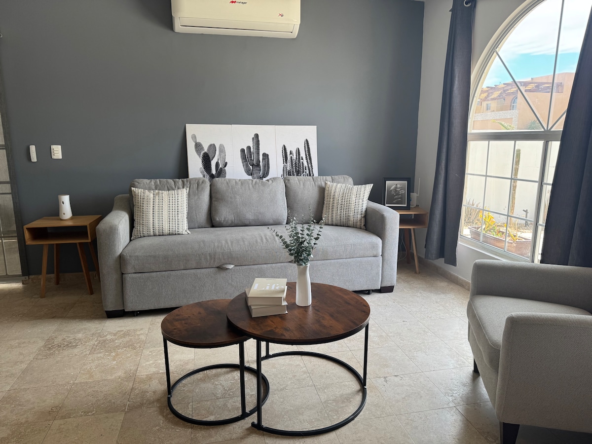 Откройте для себя суть Кабо с нашим отличным расположением – всего в одном квартале от пляжа и всего в 50 шагах от пристани. Этот очаровательный мексиканский кондоминиум предлагает роскошь удобной кровати размера Queen size и King size для вашего комфорта! Расслабьтесь на террасе на крыше, где можно отдохнуть в гамаке и зажечь гриль или погреться на солнце в шезлонге у бассейна. Наслаждайтесь удобством полностью укомплектованной кухни и подключитесь к высокоскоростному WI-FI. Ваш отдых в Кабо ждет!