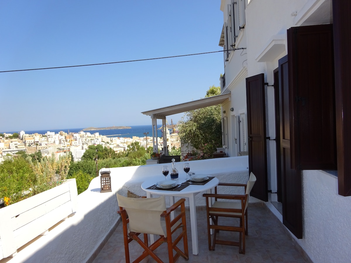 Полностью оборудованная однокомнатная квартира с видом на море. Одна двуспальная кровать в спальне, полностью оборудованная кухня (духовка, холодильник с морозильной камерой, посудомоечная машина, 4 ямы), ванная комната с ванной , стиральная машина, собственная терраса со стульями и столом. Доступ в общее патио с прямым выходом на море (скалы), где гости могут поплавать утром. Из гостиной и спальни открывается вид на море. В нескольких шагах от центра Эрмуполиса.
