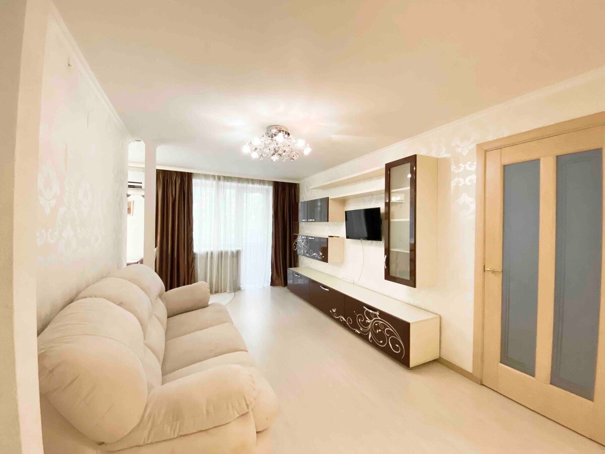Уютная, чистая, с новым ремонтом. — До 4-й больницы, больницы — 1,5 км. — 7 км до автобусного и железнодорожного вокзалов. — Рядом магазины ATB, Silpo, Eva, базар, пиццерии, аптеки, банк. — Трамвай 5, маршрутки 86, 39. — 5 этаж (последний, без лифта). — Окно от пола до потолка. — Двуспальная кровать. — диван-кровать; (3 кровати) - Кондиционер Горячая вода. — Smart TV, Wi-Fi. — Ванна, стиральная и сушильная машины. Микроволновая печь, электрический чайник, холодильник. — фен, утюг; — Посуда, чай, сахар. — свежее постельное белье и полотенца;
