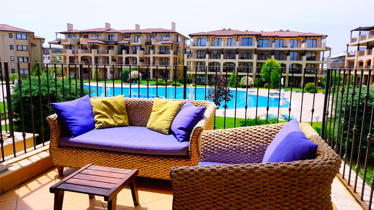 Стильная двухкомнатная квартира (70 кв. м) в Lighthouse Golf с панорамным видом на поле для гольфа. Жилье расположено в центре поля для гольфа в Черном море, всего в 10 минутах езды от Балчика. В квартире современная мебель, оборудованная кухня, три балкона и кондиционер. В комплексе есть бесплатный бассейн и шезлонги, а также СПА-САЛОН, тренажерный зал и частный пляж за дополнительную плату. Идеально подходит для отдыха, семей с детьми и любителей гольфа. Рядом Варна, Албена и Балчикский аэропорт.