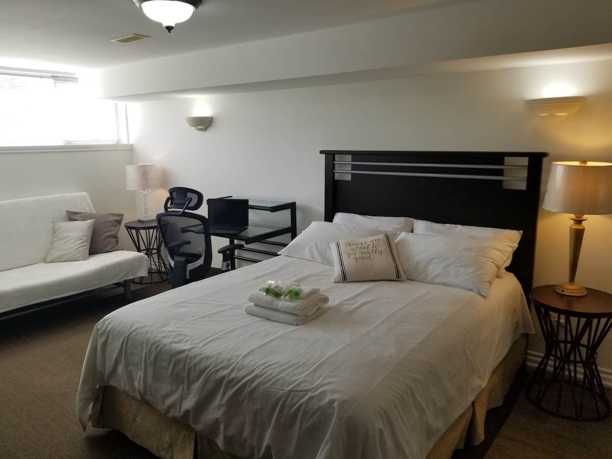 Насладитесь частной квартирой-студией в подвале с выходом на большой задний двор, недалеко от центра города, со стиральной машиной, сушилкой и парковкой. Рядом с транспортом , прогулками на природе, магазинами и собственной ванной комнатой и душем, отдельной гостиной и спальней. Холодильник, микроволновая печь, кофемашина, небольшая раковина и электрическая плита. Кастрюли, сковородки, тарелки, чашки, кухонная утварь, утюг и гладильная доска включены в стоимость проживания.