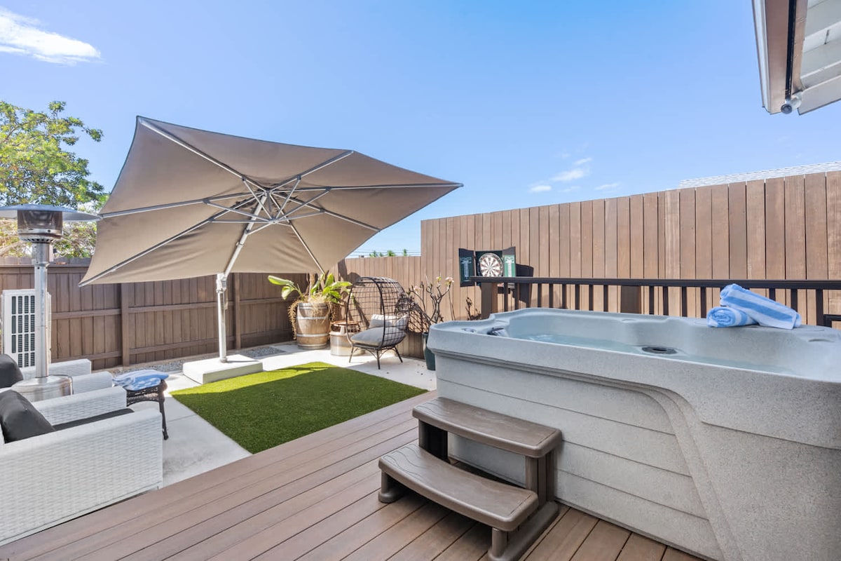 The Sanctuary - это полностью отремонтированный таунхаус, расположенный всего в 5 домах от белого песка Мишен-Бич. В этом жилье есть удобства, включая отдельную сауну, примыкающую к главной спальне, джакузи на открытом воздухе, вмещающее до 5 человек, гостиную для костра в патио и гостиную на крыше, где можно насладиться закатами и фейерверками. Кухня полностью укомплектована всей необходимой техникой, включая блендер и капельный кофе. Портативная Bluetooth-колонка для пляжа или рядом с жильем!