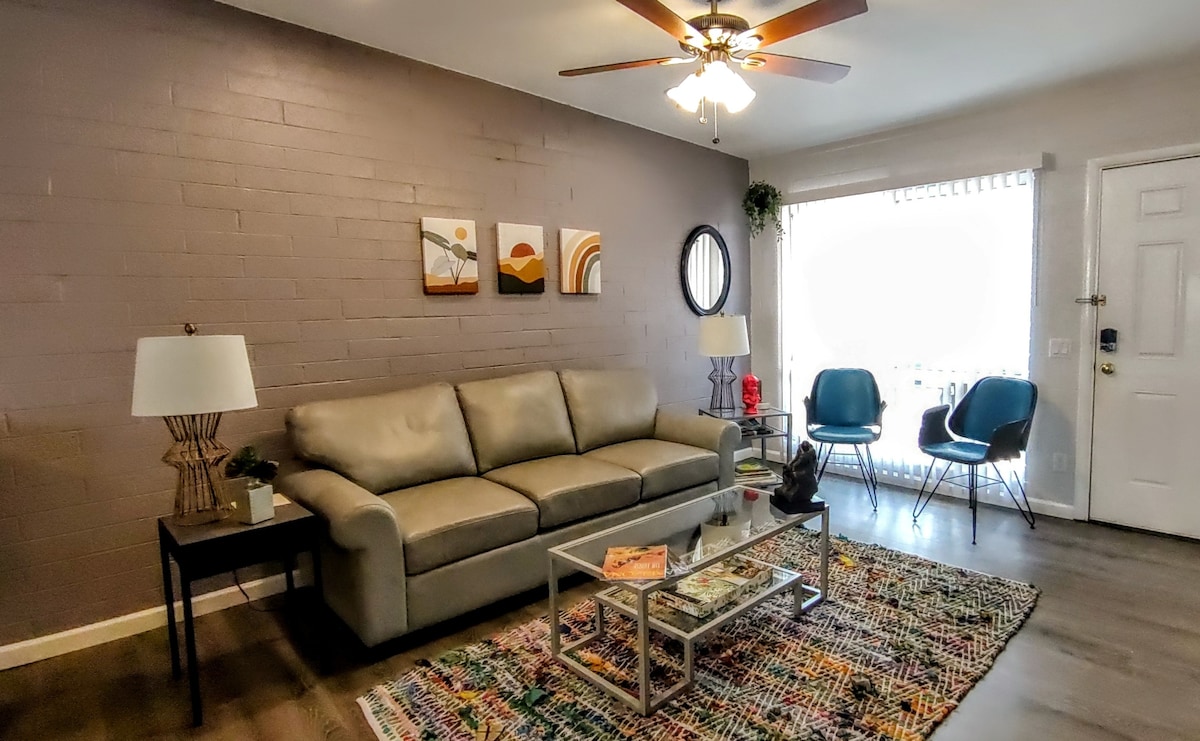 Расслабьтесь в моем недавно отремонтированном кондоминиуме прямо в центре Старого города Скоттсдейла. В этом кондоминиуме 750 кв. футов есть 1 спальня с двуспальной кроватью размера King size с матрасом Serta iComfort и постельное белье премиум-класса, большой гардероб, полностью отремонтированная ванна с ванной/душем и большая гостиная с раскладным диваном с матрасом с эффектом памяти. Совершенно новая кухня со всеми новыми шкафами, высококачественными гранитными столешницами и приборами из нержавеющей стали. Полностью укомплектованная кухня. Огромный бассейн с подогревом, гидромассажная ванна и тренажерный зал.