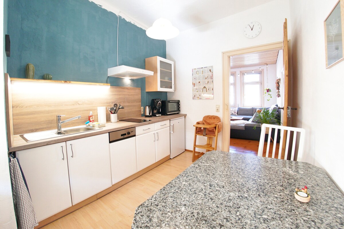 Herzlich Willkommen in unserem 130 Jahre alten Fachwerkhaus am Fuße der Wartburg! Einst als Schmiede genutzt, bietet es heute eine familienfreundliche Ferienwohnung mit umfassender Ausstattung. Sie ist zentral in Eisenach gelegen mit kurzen Wegen zum Zentrum, zu Einkaufsmöglichkeiten, Touristenattraktionen sowie zur einzigartigen Natur im Thüringer Wald! Unser Kinderzimmer befindet sich direkt über der Ferienwohnung. Wir geben unser bestes, dennoch können entsprechende Geräusche zu hören sein.