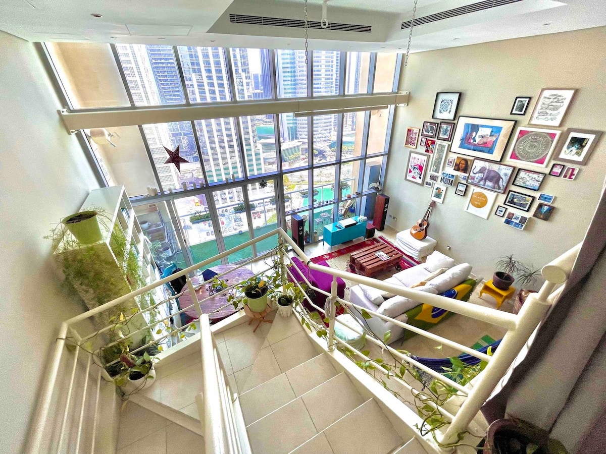 Добро пожаловать в нашу просторную квартиру-лофт с 1 спальней и открытой планировкой с балконом, спальней в мезонине и окном высотой 17 футов, откуда открывается потрясающий вид на город и много естественного света. У нас есть бассейн, тренажерный зал, сауна, парильная комната и зона для барбекю. Жилье расположено в оживленном районе JLT рядом с магазинами, ресторанами, парком, торговыми центрами, районом Дубай Марина, JBR и пляжем. Такси доступно круглосуточно и менее чем в 5 минутах ходьбы от станции метро. Идеально для деловых путешественников, одиночных и пар и пар.