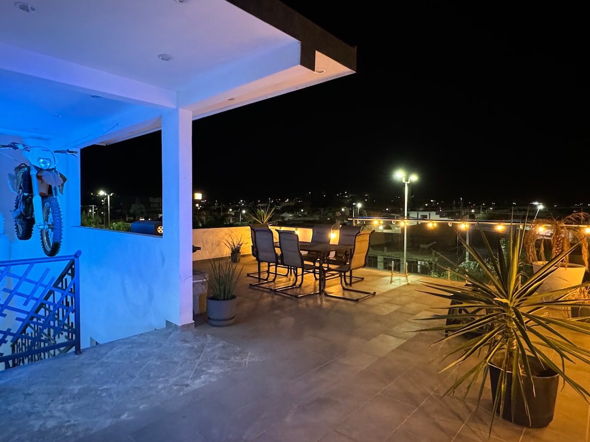 Я приглашаю вас остановиться в моей «мужской пещере» На 4-м этаже с большой террасой можно провести приятное пребывание, наслаждаясь захватывающими видами, особенно на рассвете и закате. *Дружелюбный к 420 — это не семейная обстановка* Проведение вечеринок категорически запрещено В ней есть 1 спальня и ванная комната с туалетом и гидромассажной ванной.